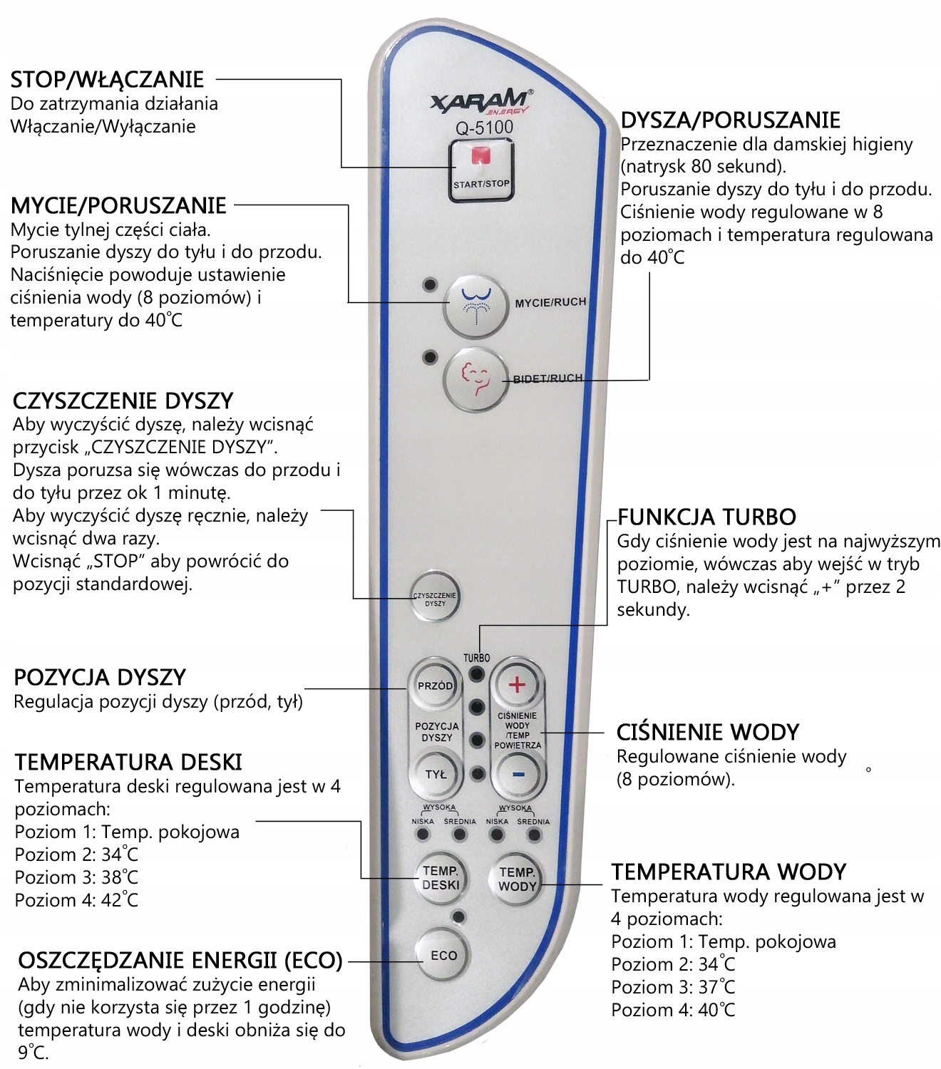Электронное биде XARAM Energy, модель Q-5100 p имеет, среди прочего, такие функции как: стирка женская и мужская, доска с подогревом, подвижные и регулируемые форсунки, аэрация воды, нагрев воды (в баке), автоматическая очистка форсунок, регулировка температуры воды, регулировка положения форсунок, регулировка давления воды, функция энергосбережения, антибактериальная. кожух и медленно падающая доска.