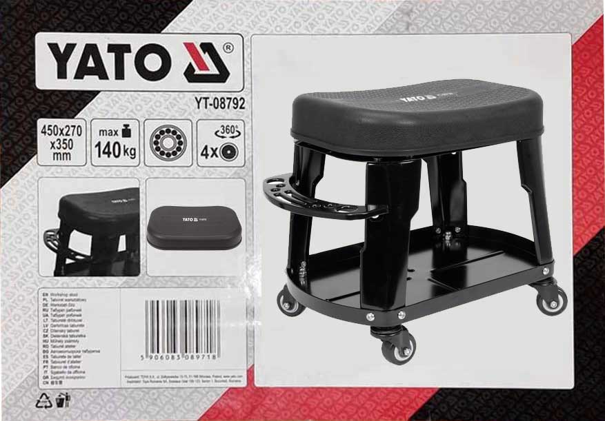 Табурет марки YATO с колесами на шарикоподшипниках обеспечит комфорт во время работы в мастерской.