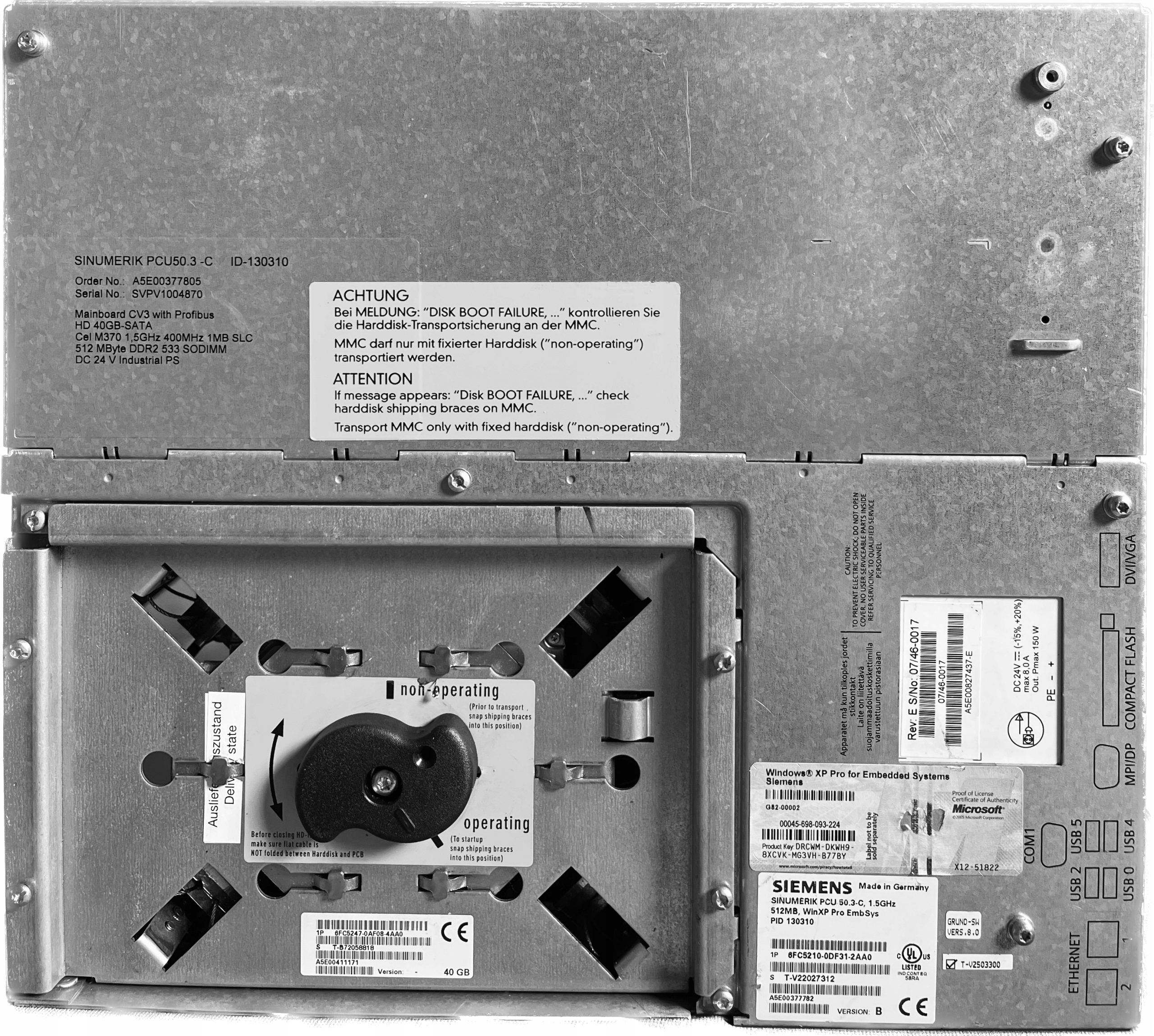В продаже имеется компьютер Siemens PCU 50.3, работающий в системах управления Sinumerik. Никакого жесткого диска — нужен свой с операционной системой для данной машины — крепления для дисков включены. Мы можем помочь в этом вопросе.