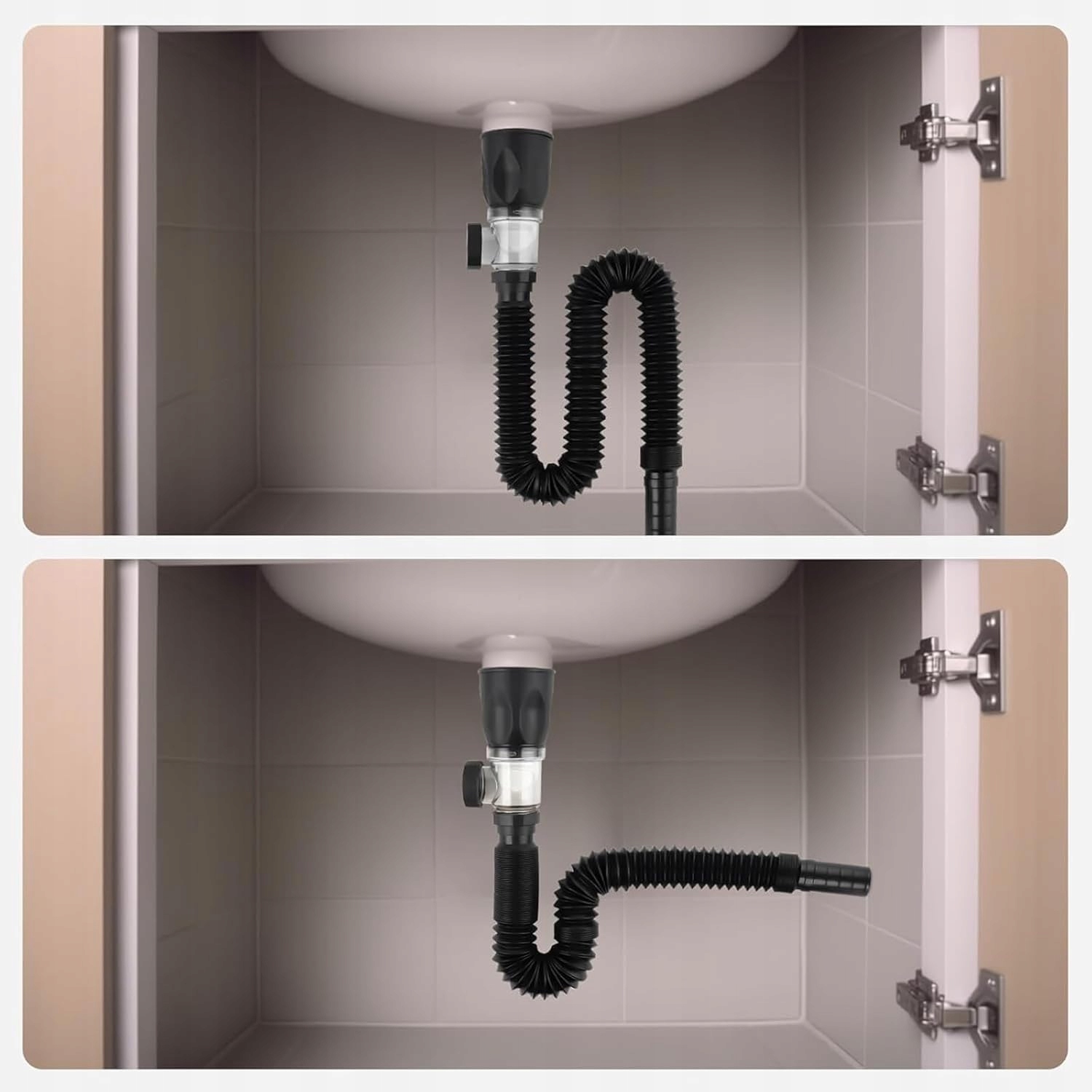 💧💧[Два сливных патрубка]: Гибкий сливной шланг можно установить снизу или сбоку, чтобы обеспечить слив воды в умывальниках с перегородками/ящиками/настенными/напольными сливами.