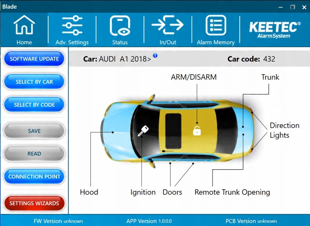 Blade Car Alarm содержит самую современную базу данных с обработанным транспортным средством. База данных регулярно обновляется (каждый месяц). Версия программы может быть изменена путем подключения кабеля Micro USB (не входит в комплект)