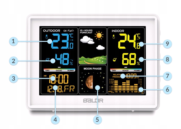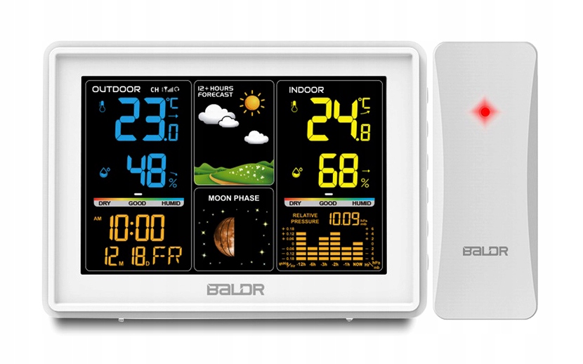 Многофункциональная беспроводная метеостанция Baldr B359-V2 с функцией оповещения о погоде: измеряет температуру в помещении и на улице, а также прогнозирует местный прогноз погоды, что делает его идеальным выбором для получения точных измерений. Устройство имеет элегантный, легко читаемый дисплей, на котором отображаются подробные данные о температуре, влажности и прогнозе. Входящий в комплект беспроводной дистанционный датчик с радиусом действия до 100 метров позволит отображать условия, в которых он находится, например, детская комната, улица, подвал или склад.