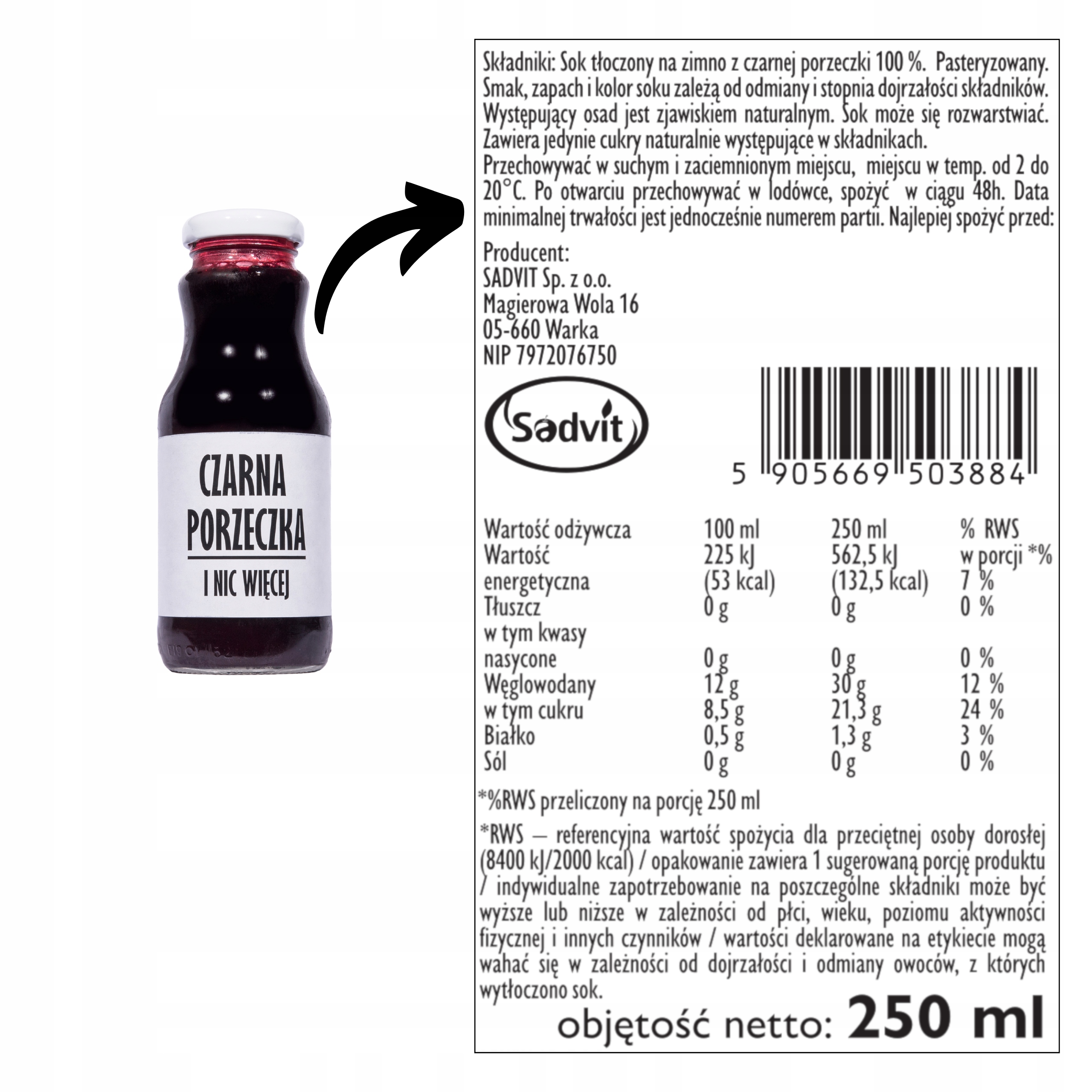 Сок с холодным отжимом из черной смородины 100%. Пастеризованный. > Хранить в сухом и затененном месте при температуре от 2 до 20 ° С. После открытия храните в холодильнике, потребляйте в течение 48 часов Противопоказания: