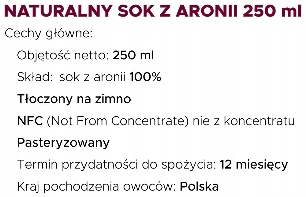 Сок черноплодной рябины темно-красного цвета изготавливается из ягод черноплодной рябины (Aronia melanocarpa), кустарника, который любит европейский климат. Однако черноплодная рябина родом из Северной Америки и принадлежит к тому же семейству, что и рябина. Своим появлением в Европе мы обязаны известному российскому садоводу Ивану Мичурину, который занимается селекцией множества различных видов растений. Черноплодная рябина очень хорошо растет и плодоносит в Польше, а плоды собирают ранней осенью.
