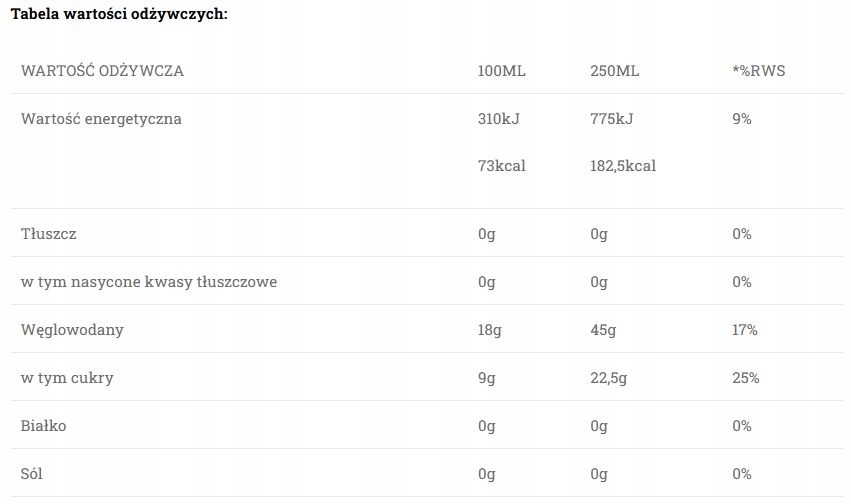 *RWS – эталонная норма потребления для среднего взрослого человека. В упаковке содержится 1 рекомендованная порция продукта. Индивидуальная потребность в отдельных ингредиентах может быть выше или ниже в зависимости от пола, возраста, уровня физической активности и других факторов. Пищевая ценность, заявленная на этикетке, вкус, запах и цвет сока могут зависеть от сорта и степени спелости плодов. Возникающий осадок является естественным явлением. Сок может отделиться. Содержит только сахара, встречающиеся в природе во фруктах.