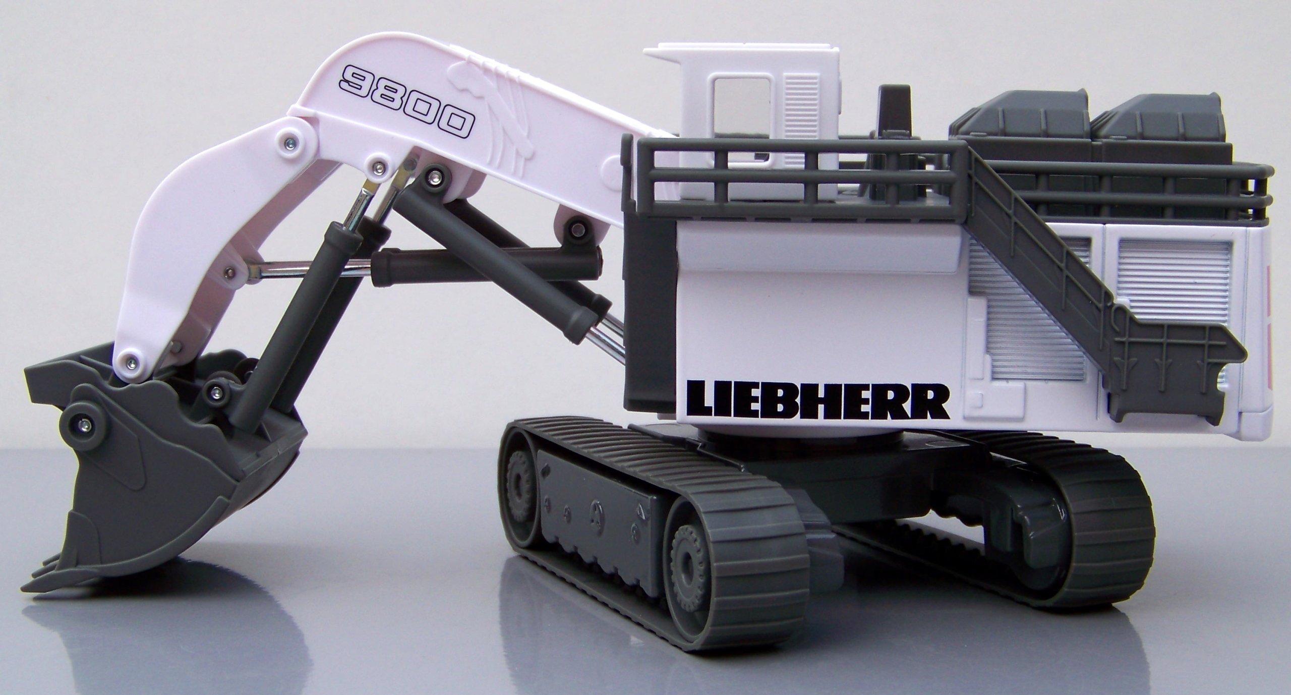 Этот гигант среди гусеничных экскаваторов на стройках и в карьерах – настоящая махина даже в масштабе H0. Современная серия R9800 от Liebherr — один из самых больших и мощных экскаваторов в мире. Транспортировку почти полностью металлической модели с одного места на другое обеспечивают две широкие гусеницы. Огромная стрела с подвижным ковшом вполне функциональна: она в мгновение ока полностью загрузит мини-самосвал. Эта уникальная модель дополнена изысканной кабиной оператора и лестницами для подъема.
