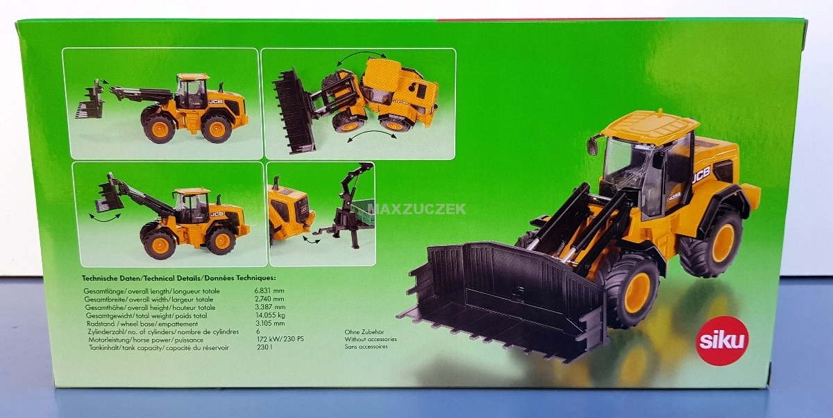 - ПРИБЛАЖНЫЕ РАЗМЕРЫ: длина 24 см, высота 10,7 см, ширина зарядного устройства 9 см, ширина ложки 13,3 см, резина. колеса, задняя сцепка - совместимо с прицепами Siku в масштабе 1:32.