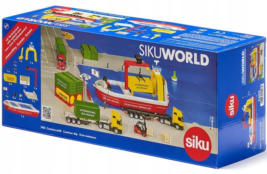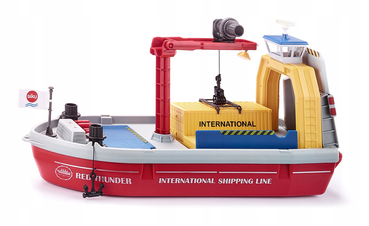 Динамичный контейнеровоз швартуется в порту с помощью двух механических лебедок. Как и в случае с крупноформатными прототипами, две цистерны внутри корабля могут быть заполнены сыпучим грузом (гранулами или песком) или двумя контейнерами. Легковые и грузовые автомобили также можно перевозить на борту контейнеровоза. Они могут проходить через корму в оба танка. Контейнеры можно перемещать вверх и вниз с помощью поворотного крана и передвижной подвесной тележки, оснащенной специальной ручкой. Конечно, они также идеально подходят для трейлеров SIKU масштаба 1:50, ожидающих на причале. Лопата, входящая в комплект, пригодна для погрузки и разгрузки.