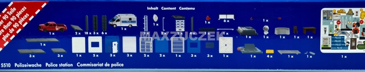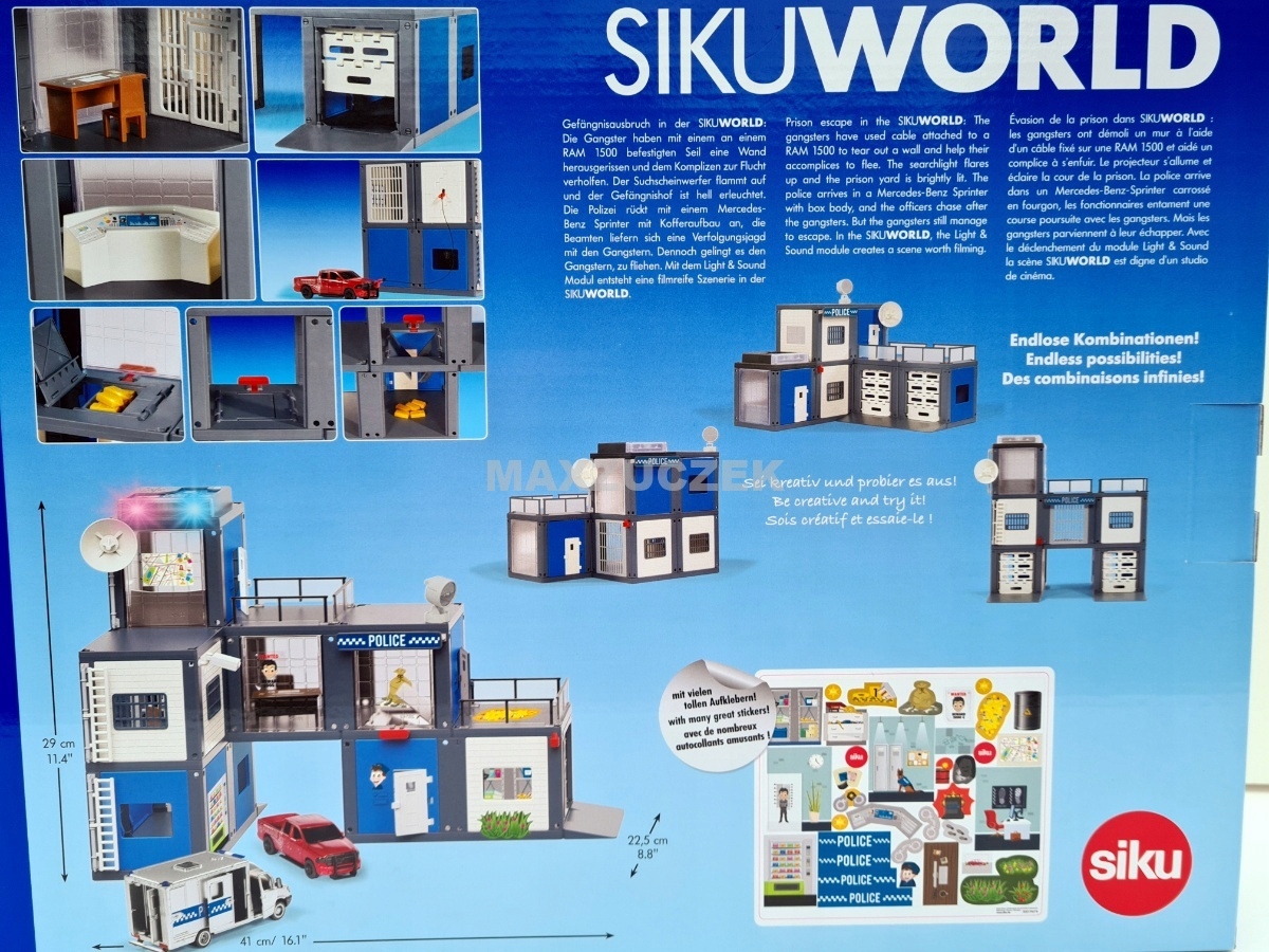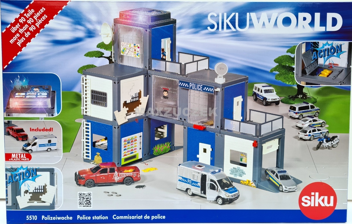 Полицейский участок SIKUWORLD совместим с другими наборами SIKUWORLD, но с ним можно играть и самостоятельно. Содержит элементы здания, такие как стены с решетчатыми окнами в общественных и служебных помещениях полиции, а также в камерах. Трехэтажное здание с террасой на крыше оборудовано типично для туалета: антенной, распашными дверями, лестницами, электролюминесцентным прожектором, спутниковой системой, столом, стульями и камерой наблюдения. Конечно, набор можно расширить множеством полицейских машин сику.