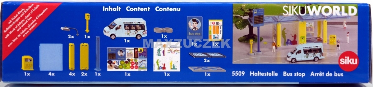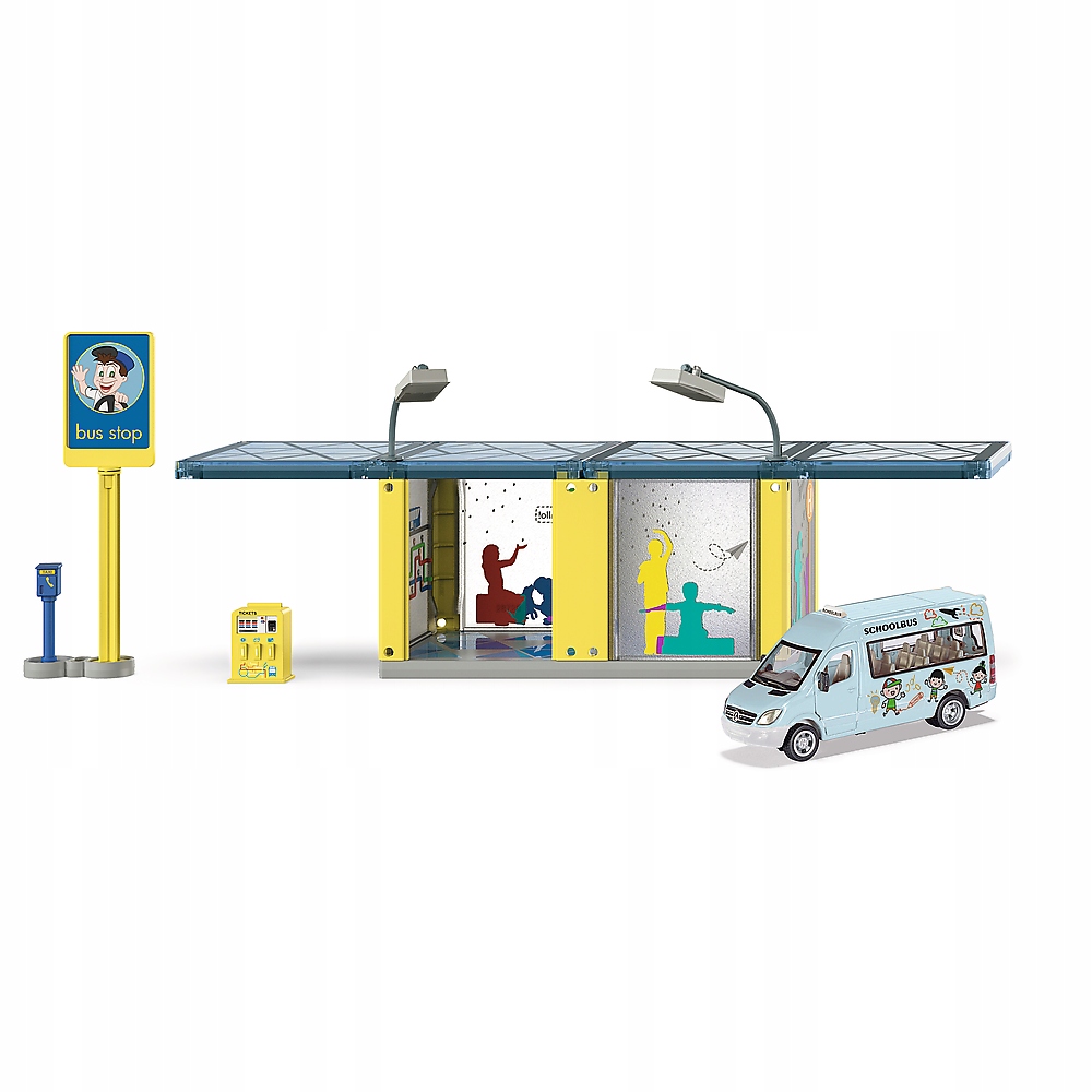 Дождь, снег, холод: иногда во время ожидания школьного автобуса погода действительно неприятная. SIKU WORLD теперь предлагает новую элегантную остановку с прозрачной крышей и стенами. Две большие лампы освещают автобусную остановку в темное время суток. Развлечься на остановке можно благодаря детальному оборудованию – билетному автомату, доске объявлений и столбу с телефоном экстренной помощи. Время летит быстро: уже подъезжает синий школьный автобус с яркими принтами. В набор входит модель Mercedes-Benz Sprinter. Остановку также можно идеально совместить с автобусами и трамваями Siku или использовать в качестве пересадочного терминала. Билеты на автобус можно загрузить с сайта