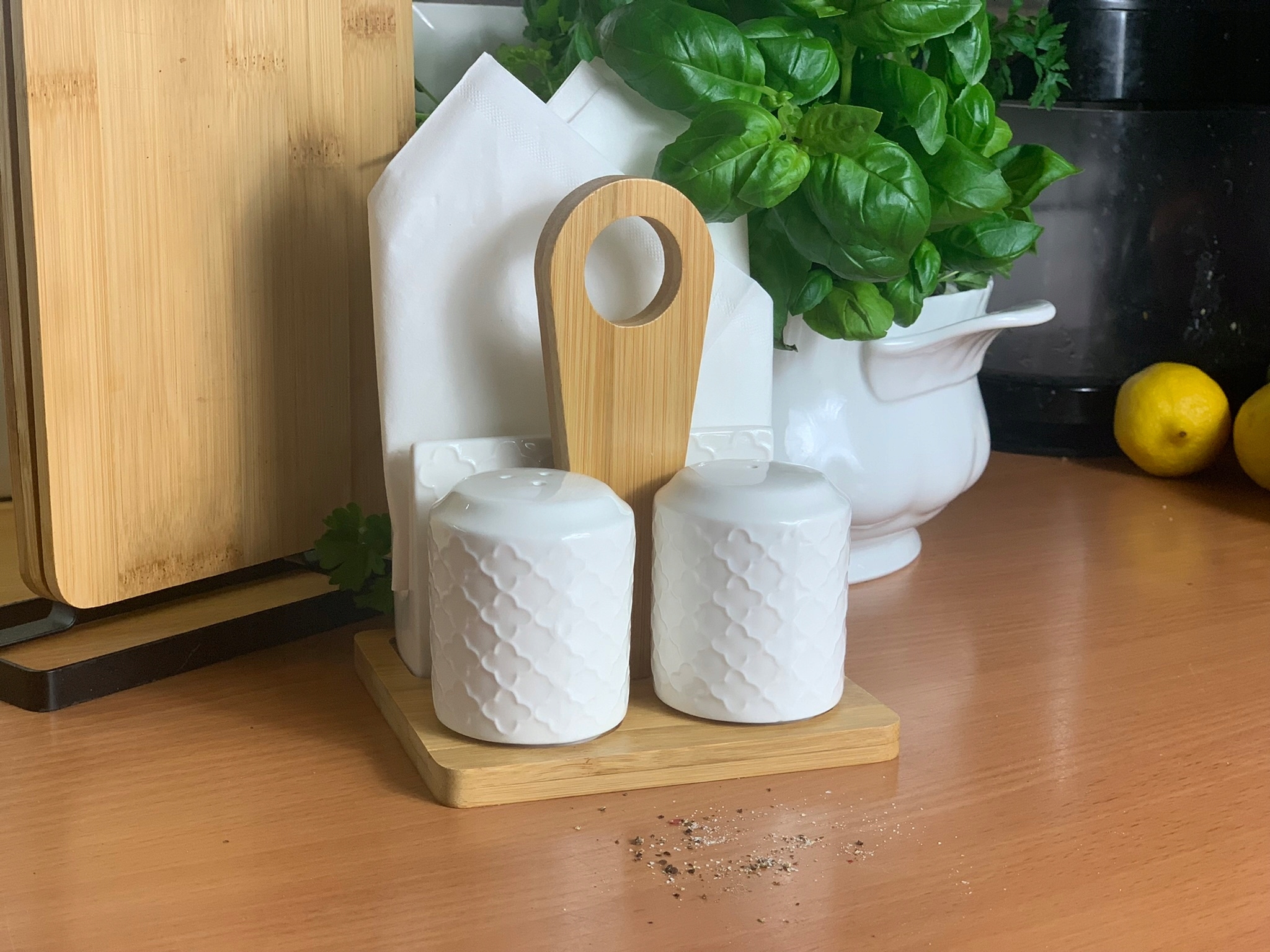 Фарфоровая солонка и перечница на бамбуковой основе прекрасно впишется в вашу кухню, столовую и будет прекрасно смотреться на вашем столе.