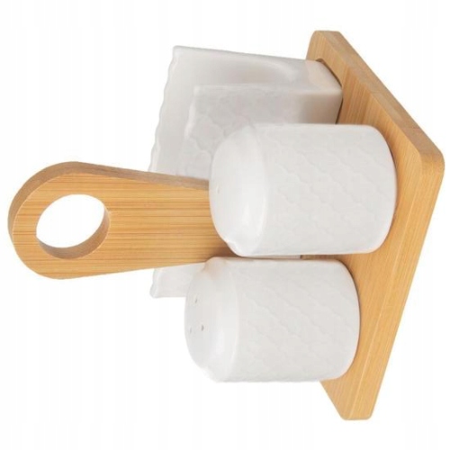 Контейнеры имеют изящное тиснение и изготовлены из белого фарфора. Салфетница является дополнительным элементом набора и также имеет тиснение. Бамбуковая подставка имеет ручку, которая облегчает переноску набора, она также эстетична и создает единое целое.