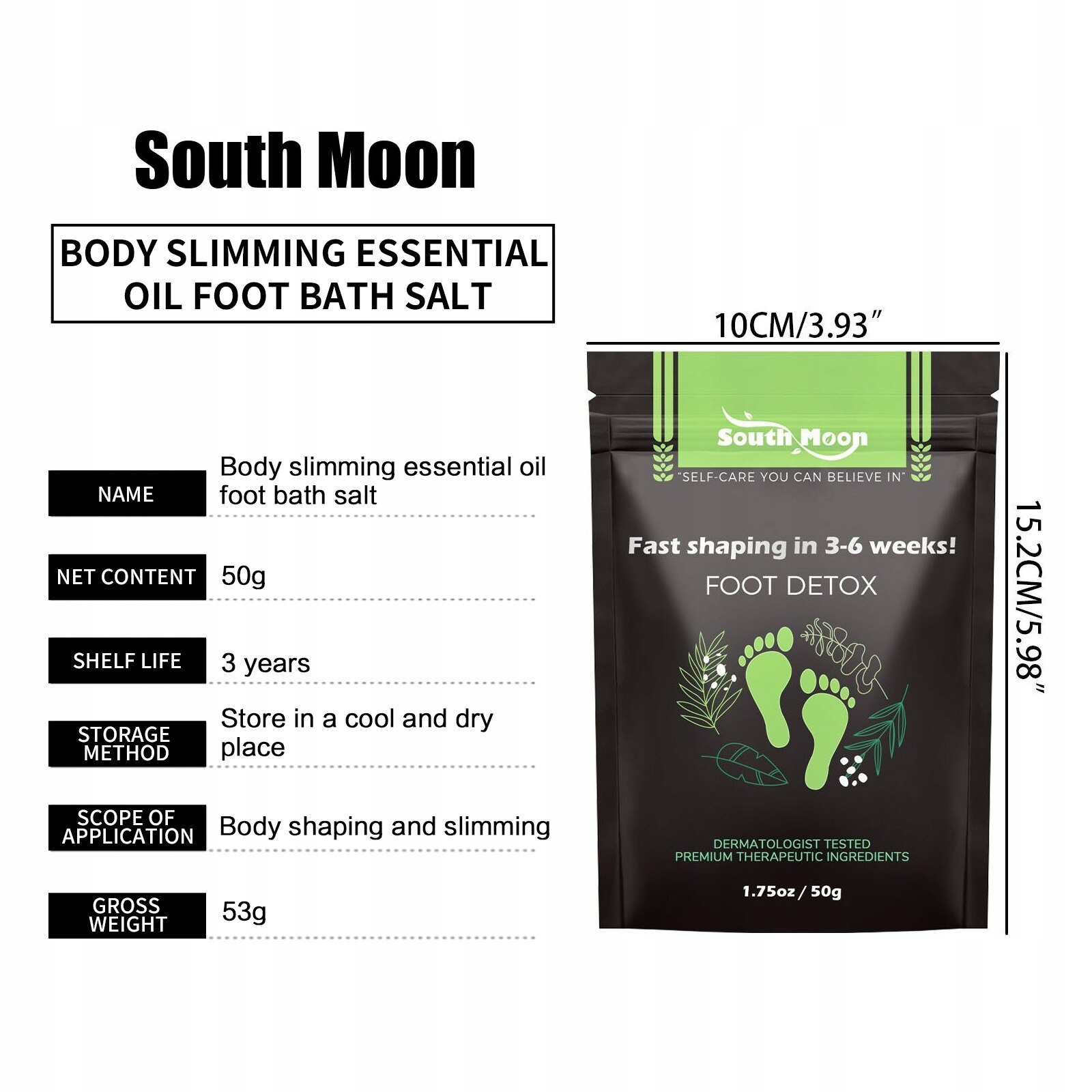 В комплект поставки входят: 1*50 г соли для ванн для ног, способствующей быстрому похудению.