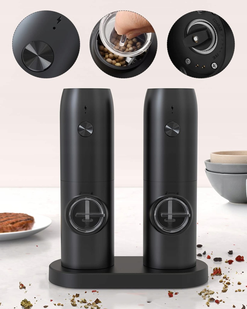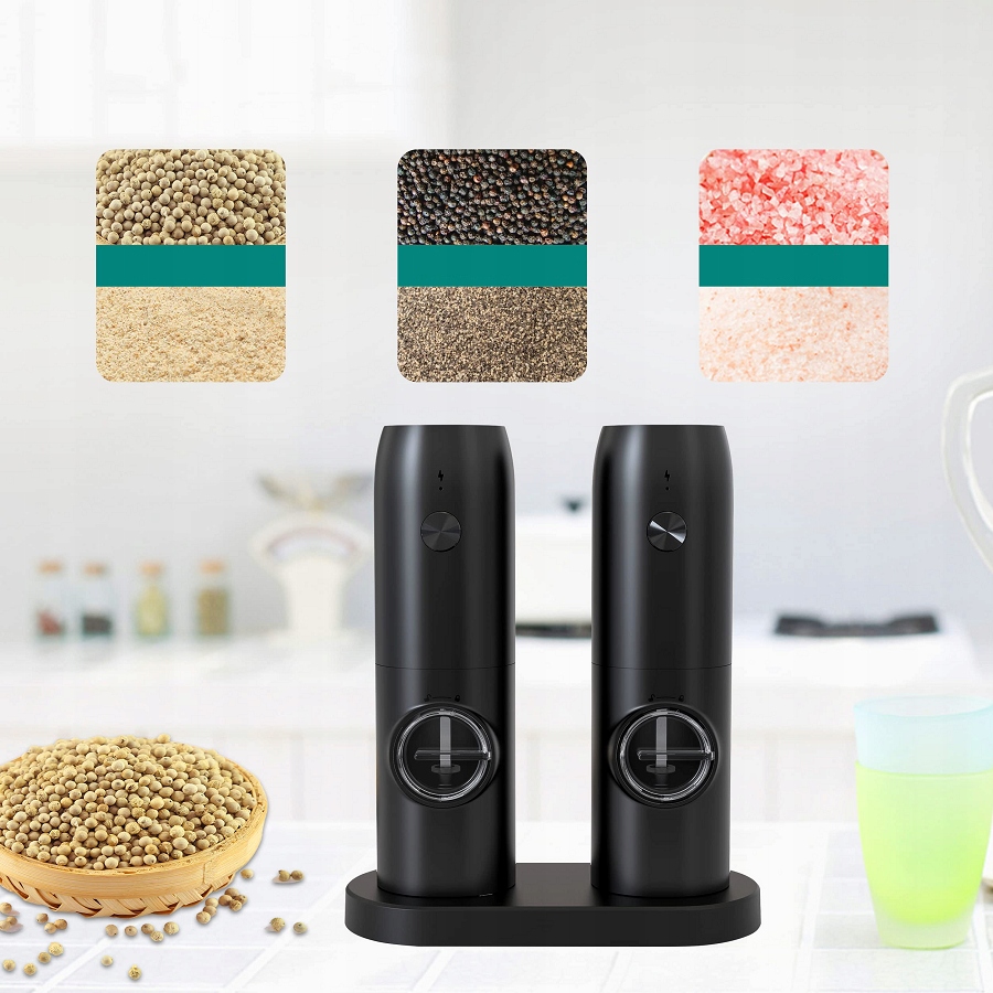 соль и перцем из основания с основой, самая большая емкость перца измельчителя составляет 70 мл, вы можете измельчить специи, по мере необходимости. Есть две мельницы и база, которую можно легко установить, когда вы свободны.