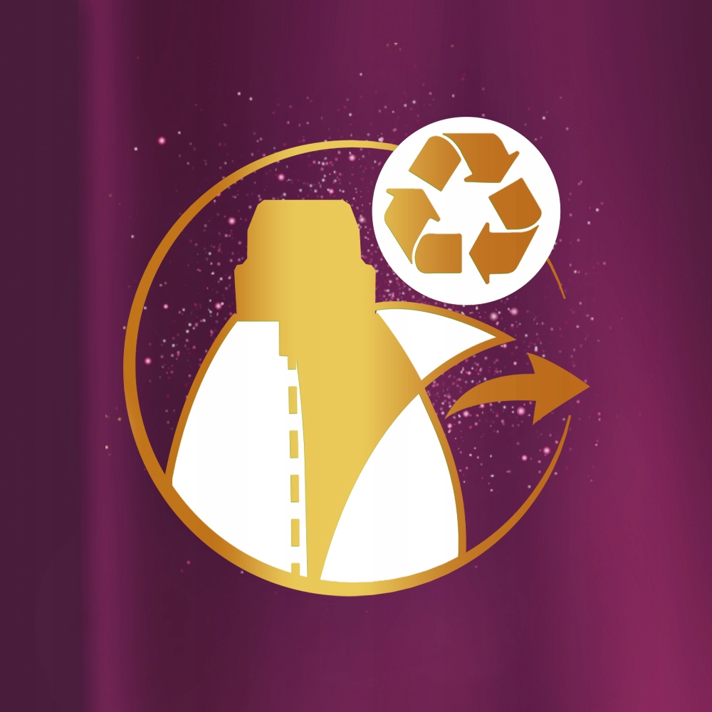 Упаковка также на 100% пригодна для вторичной переработки. Просто снимите фольгу — рекомендуется отделять бутылку, обертку и пробку отдельно.