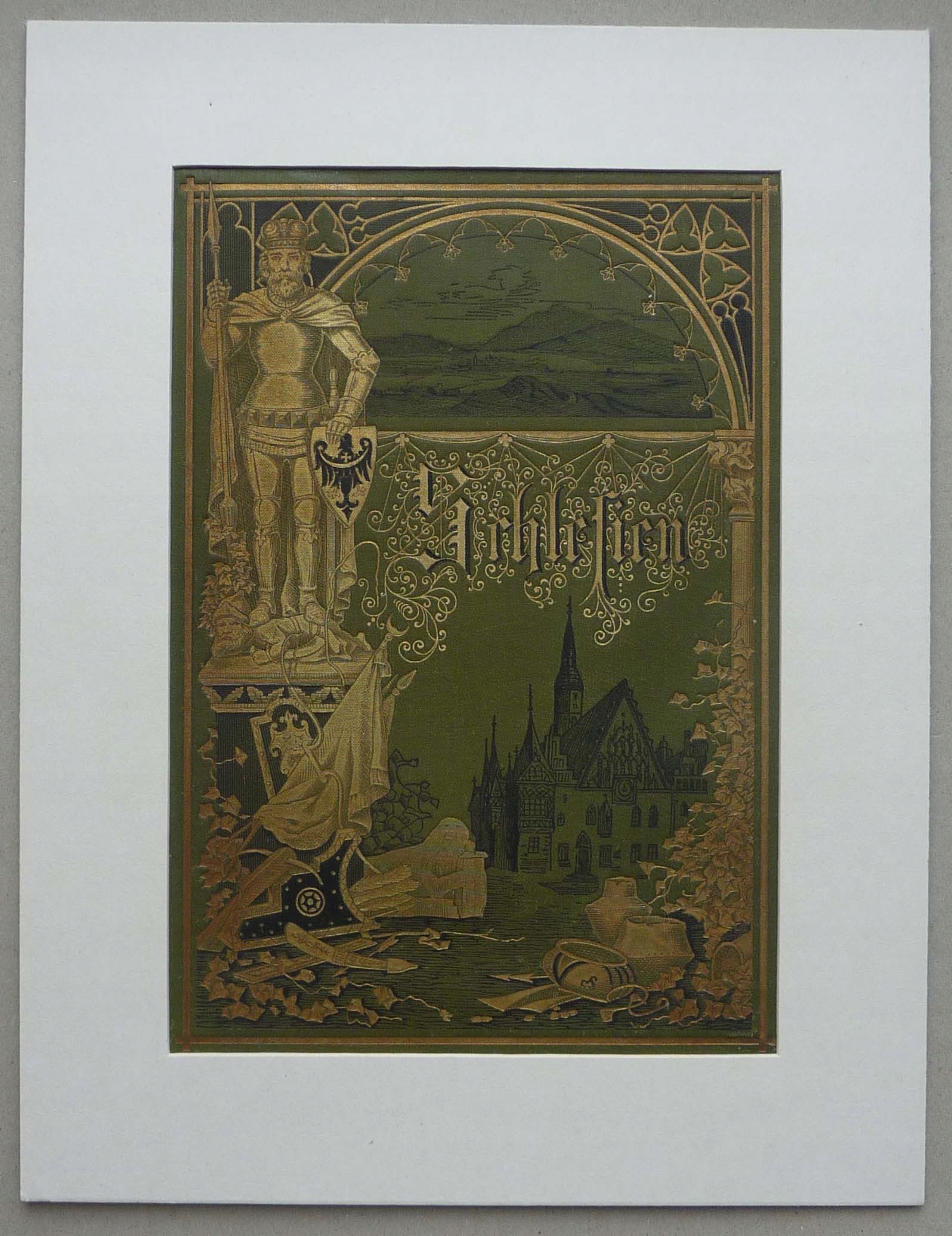 Композиция представляет собой оригинальную переднюю обложку монументальной работы Франца Шроллера Шлезена. Eine Schilderung des Schlesierlandes, который был опубликован в Глогове в 1885-1889 годах, и изображал красоту силезской земли и проиллюстрировано сотнями (!) Фигурами Теодоры Блаттербауэра в стали и навесной клетке. 31.7 x 24.3 (изображение Passe-Partout в клиренсе приблизительно 23,5 x 16,2), отличное поведение.