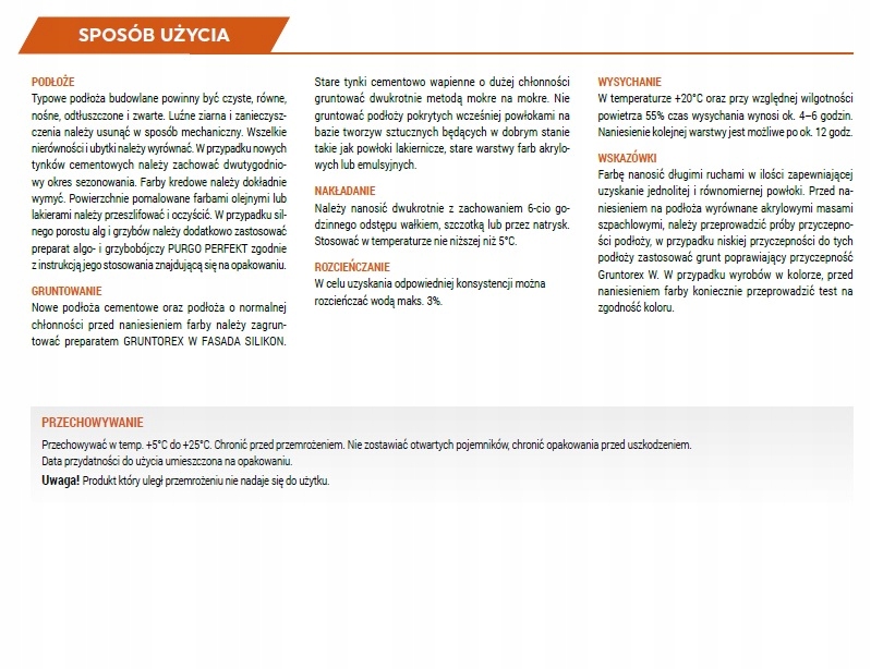 Силиконовая фасадная краска для декоративно-защитных покрытий снаружи зданий на типовых строительных основаниях, а также для обновления поверхностей, покрытых тонкослойными штукатурками. Характеризуется очень высокой укрывистостью и стойкостью к истиранию. Устойчив к микробиологической коррозии. Благодаря содержанию силиконовой смолы он обладает высокой устойчивостью к загрязнениям. Представлен в полной цветовой гамме. Перед нанесением краски загрунтуйте основание грунтовкой Gruntorex W FACADE Silikon.