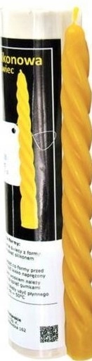 Чтобы свечу было легче извлечь из формы, рекомендуется сбрызнуть форму силиконовым спреем. Фитиль следует ввести в форму перед заливкой, он должен быть слегка натянут. Перед заливкой воска форму следует обвязать бечевкой или закрепить резинками. Для заливки формы используйте жидкий воск, нагретый до 50°С – форма должна быть надежно защищена от проливания воска.