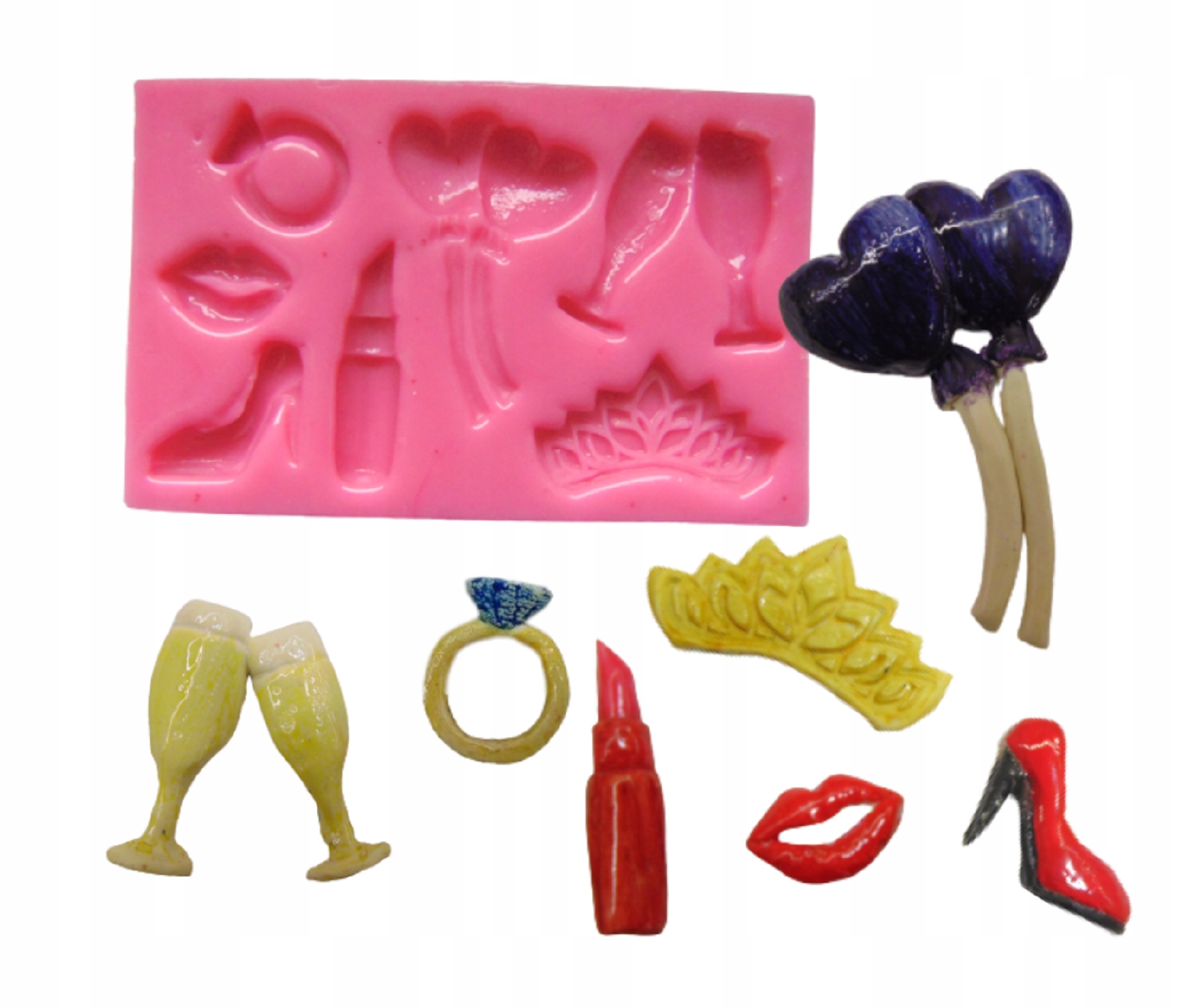 Основная тема – помада, губы, высокие каблуки, корона, воздушные шары, очки, кольцо.