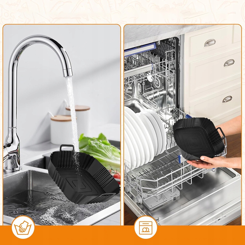 многоразовые силиконовые формы для жаркого фри из мягкого и гибкого силикона, который легко чистить. Просто переверните его и вымойте теплой мыльной водой. Наши вставки Fryer также подходят для мытья в посудомоечной машине, что облегчает очистку
