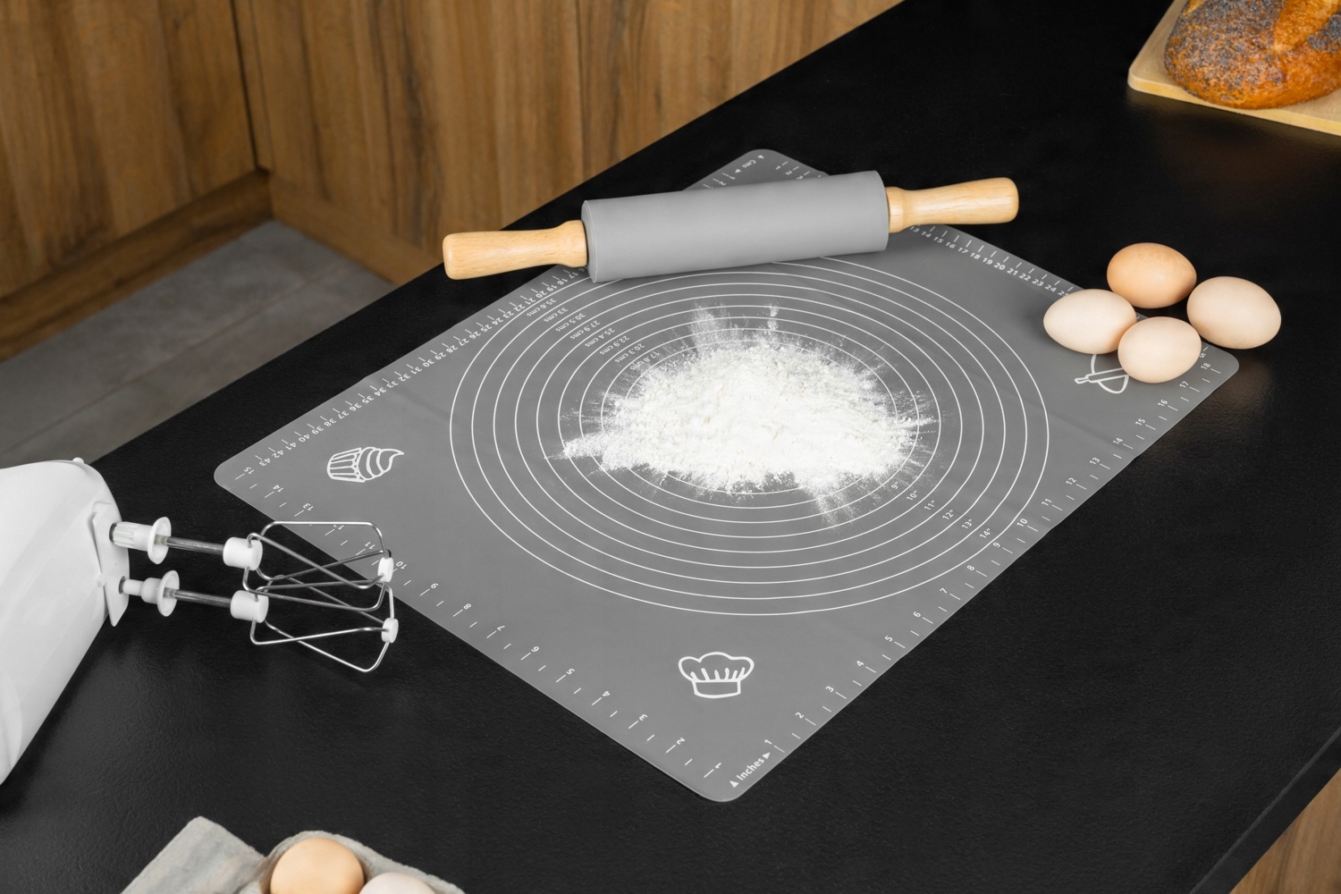 Силиконовый коврик - современная доска для катящихся пирожных. По сравнению с классическим, деревянной доской, для хранения гораздо проще - после того, как прокатывание коврика можно поместить вертикально, положить в шкаф или ящик. Большое преимущество силиконового коврика содержит его в чистоте, потому что тесто прилипает меньше к силиконовой поверхности, чем к плате, кроме того, его можно промыть в посудомоечной машине. Коврик является идеальным продуктом для приготовления пиццы - вы можете заработать на нем тесто и раскатать его до желаемого диаметра, отмеченного по шкале.