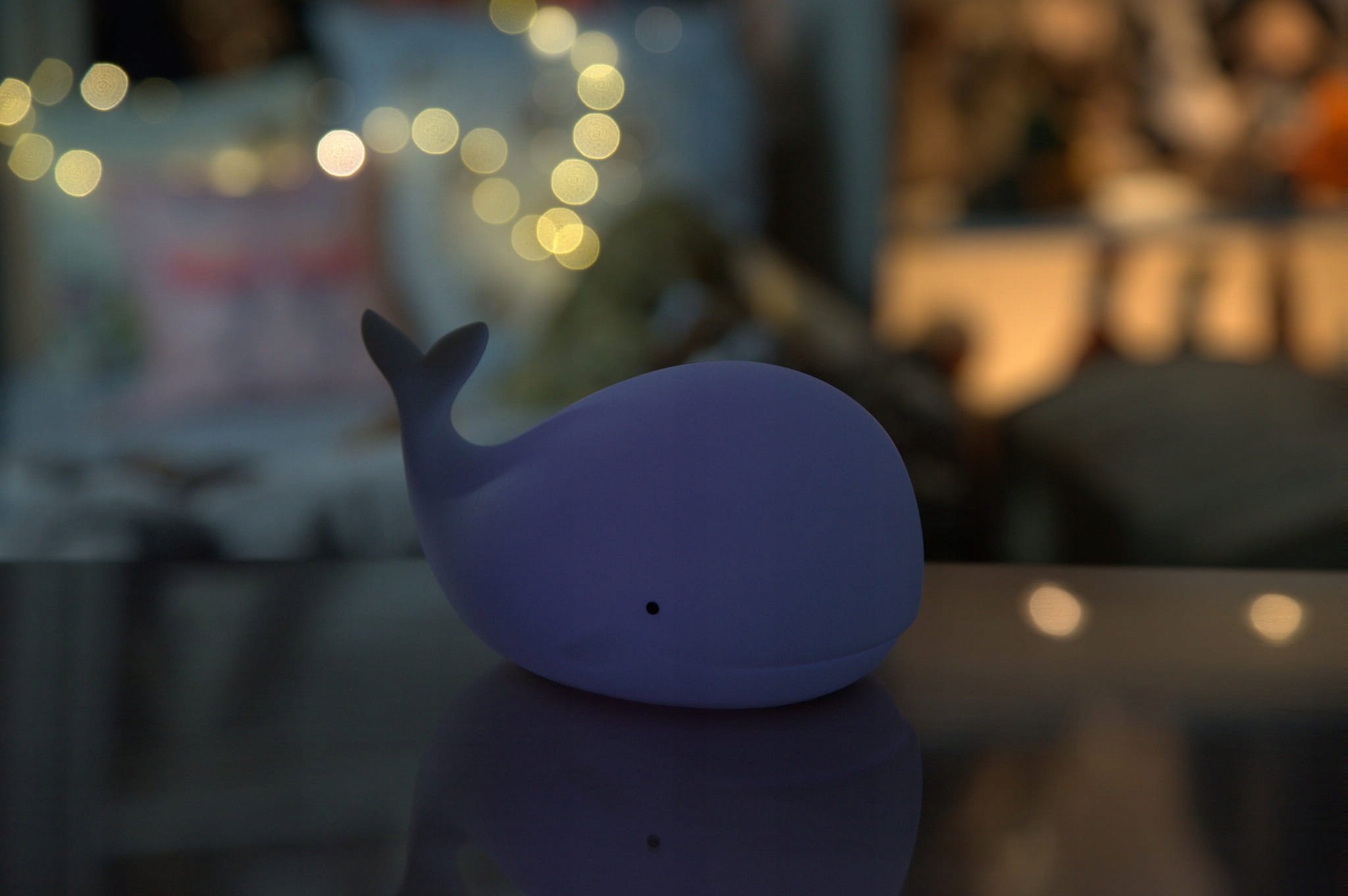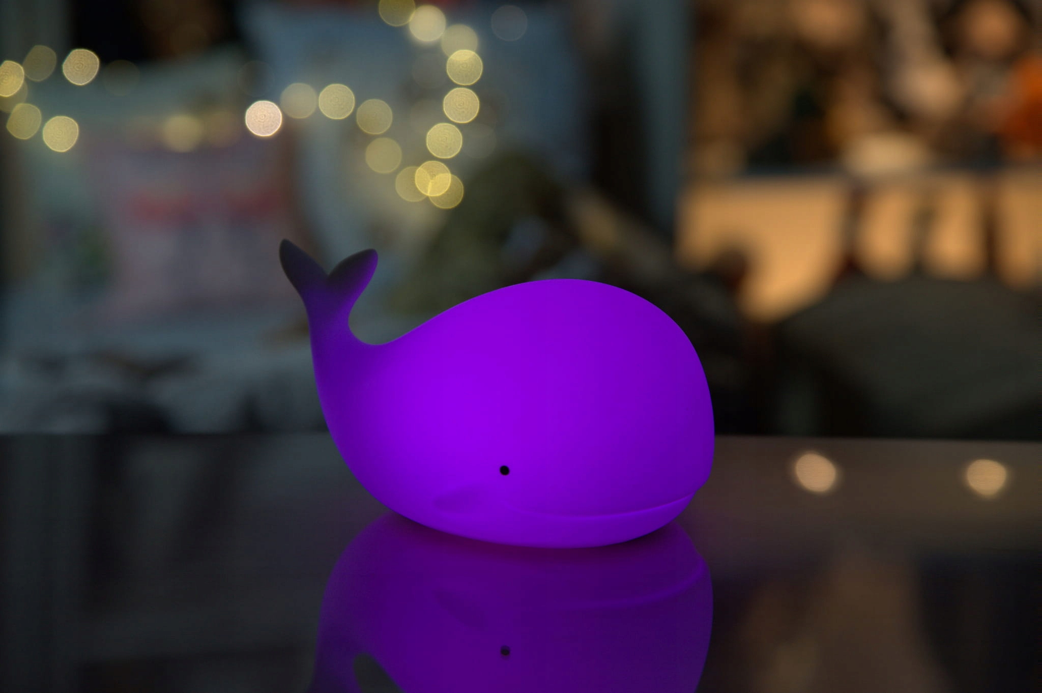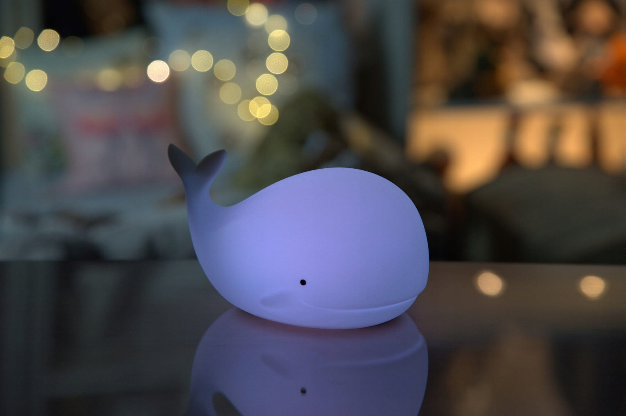Светодиодный ночник Rabbit&Friends делает детский сон более приятным, он имеет меняющиеся цвета, очаровательный форма кита, бархатистая, приятная на ощупь, изготовлена из безопасного силикона.