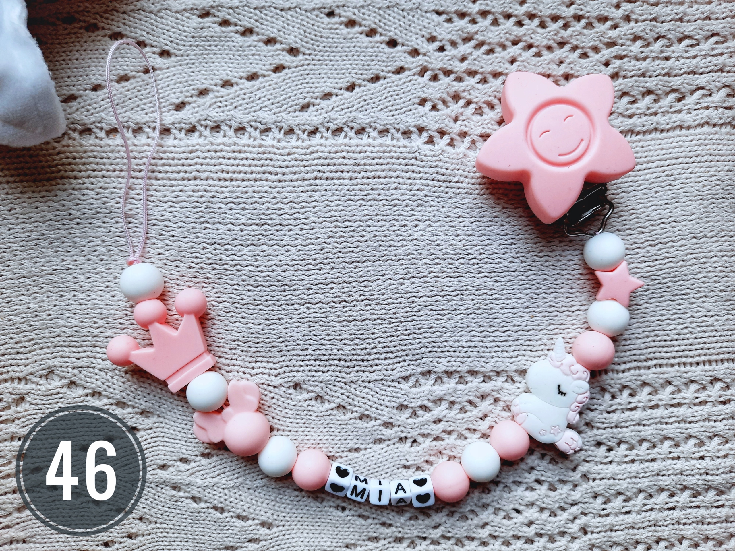 Все элементы, используемые в кулоне, сертифицированы. Силиконовые шарики диаметром 12 мм не содержат BPA, фталатов, кадмия и других вредных веществ. Размер букв 6 мм. Силиконовый или деревянный зажим, в зависимости от выбранного дизайна, с добавлением металла (на застежке).