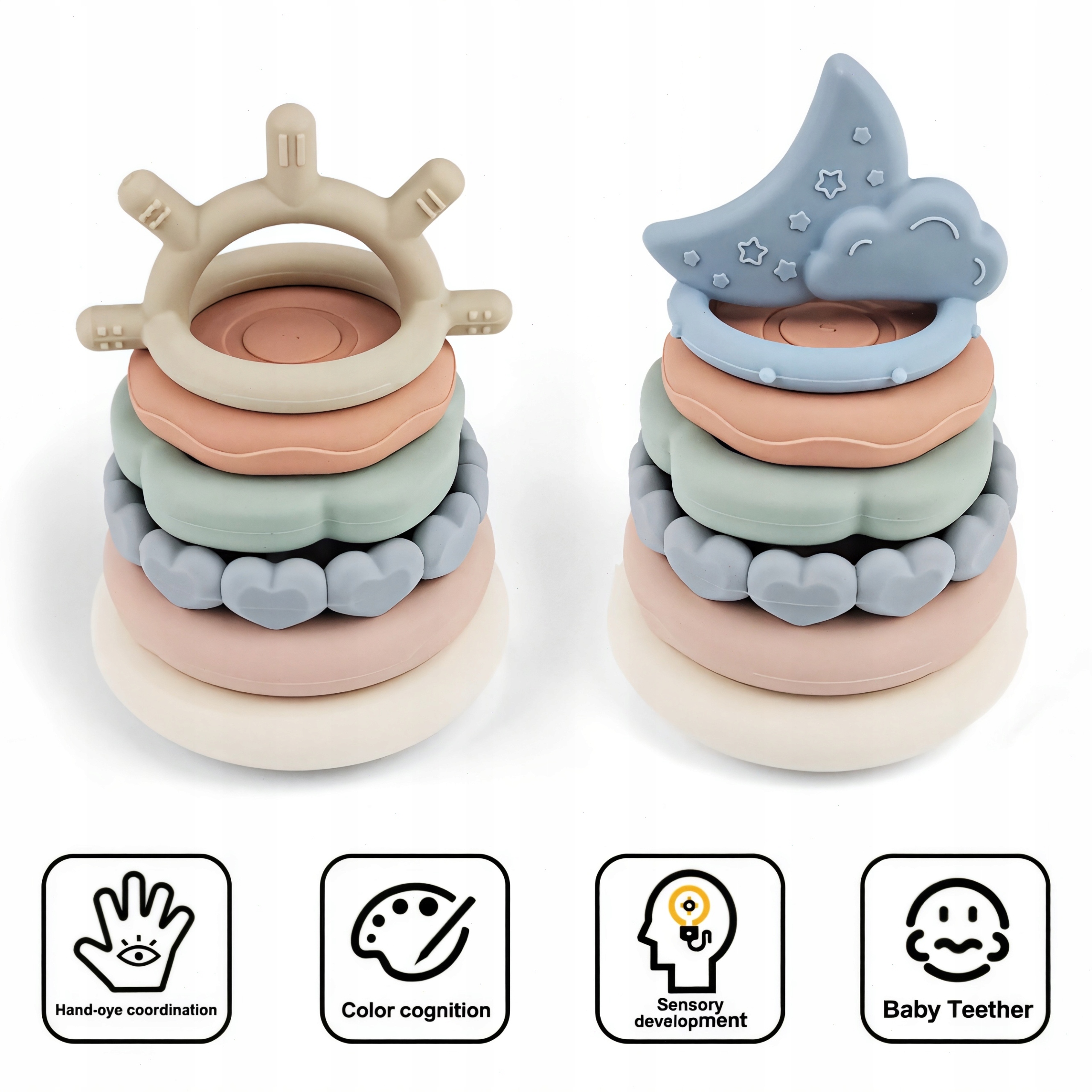 Эта уникальная силиконовая пирамидка сочетает в себе функции обучающей сенсорной игрушки и нежного прорезывателя, обеспечивая всестороннюю стимуляцию развития вашего ребенка. Каждый элемент создан с учетом потребностей маленьких ручек: он имеет выпуклые текстурированные узоры, которые развивают осязание и в то же время мягко массируют воспаленные десны во время прорезывания зубов.