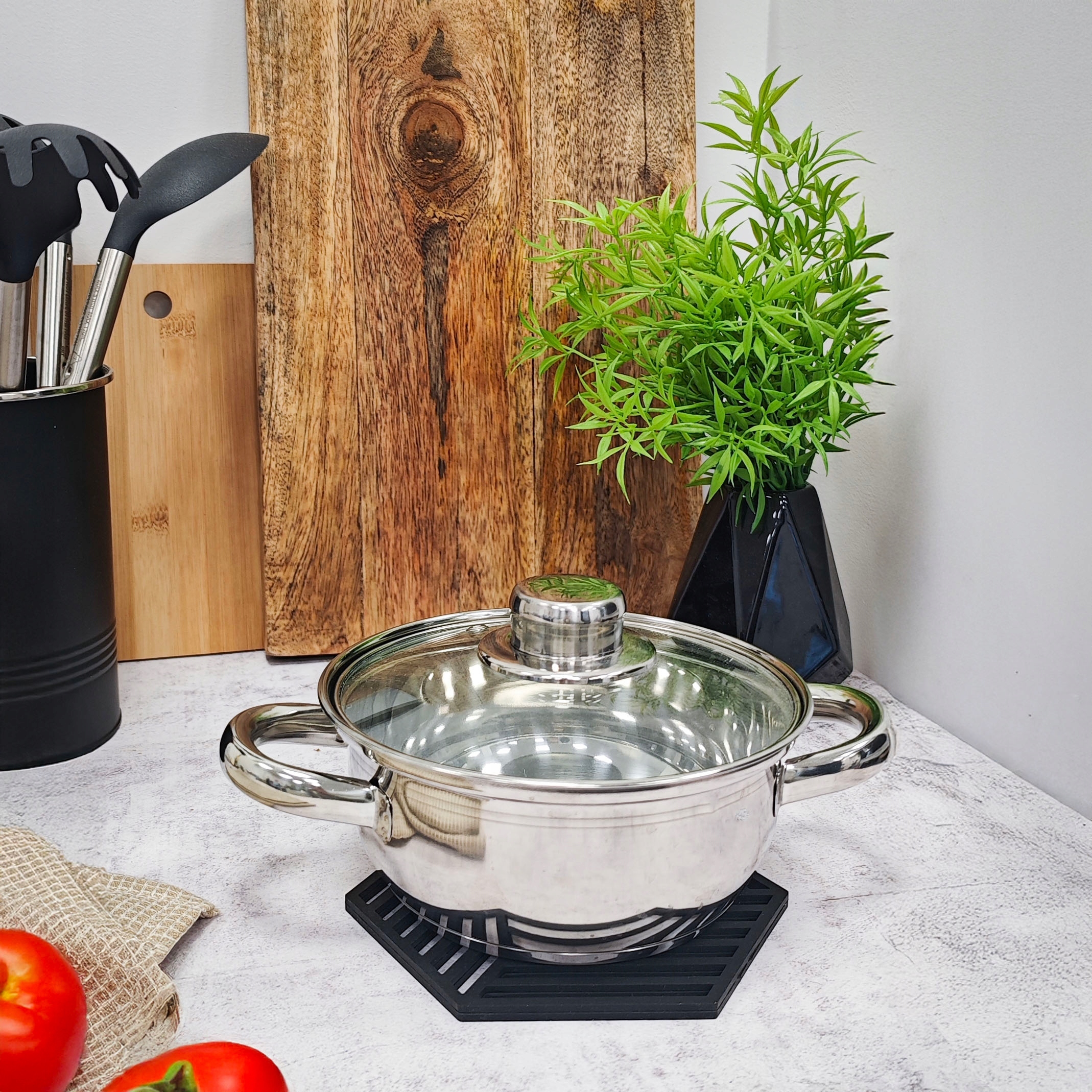 благодаря гибкому и не -скользящему материалу b>, подставка идеально прилипает к поверхности, предотвращая скольжение сосудов. Это дополнительная безопасность при перемещении горячих горшков или кастрюли.