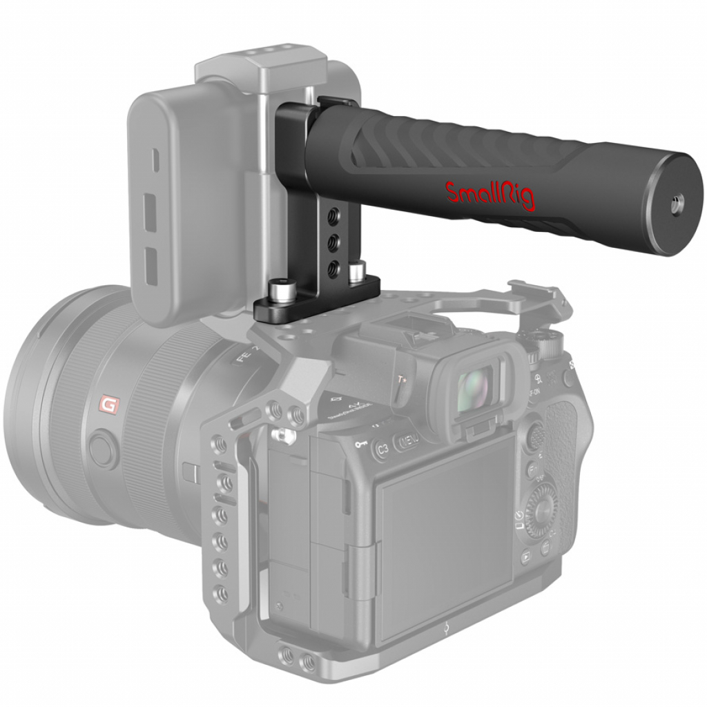 Верхняя ручка облегчает управление камерой при съемке и перемещении ее на сет . У него есть дополнительные резьбовые отверстия и холодный разъем, который позволяет расширить набор оператора путем установки аксессуаров для видео. Он прикреплен с 2 1/4 винтами