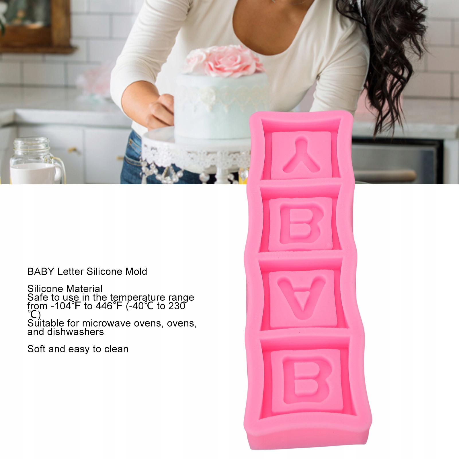 2. Безопасный материал: силикон: эта форма для букв BABY изготовлена из силикона, безопасна для температур от -104 градусов по Фаренгейту до 446 градусов по Фаренгейту (от -40 до 230), подходит для микроволновой печи, духовки и посудомоечной машины.