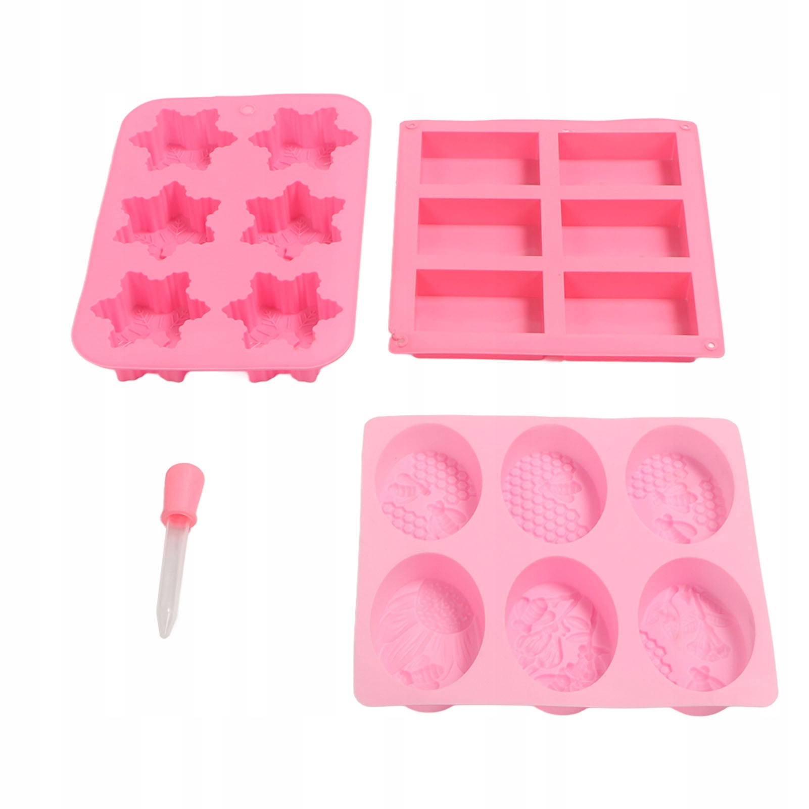 5. Упаковочный лист: В комплект входят 3 силиконовые формы для мыла, каждая разной формы: снежинка, соты и прямоугольник. Каждая форма имеет 6 отделений, всего 18 отделений.
