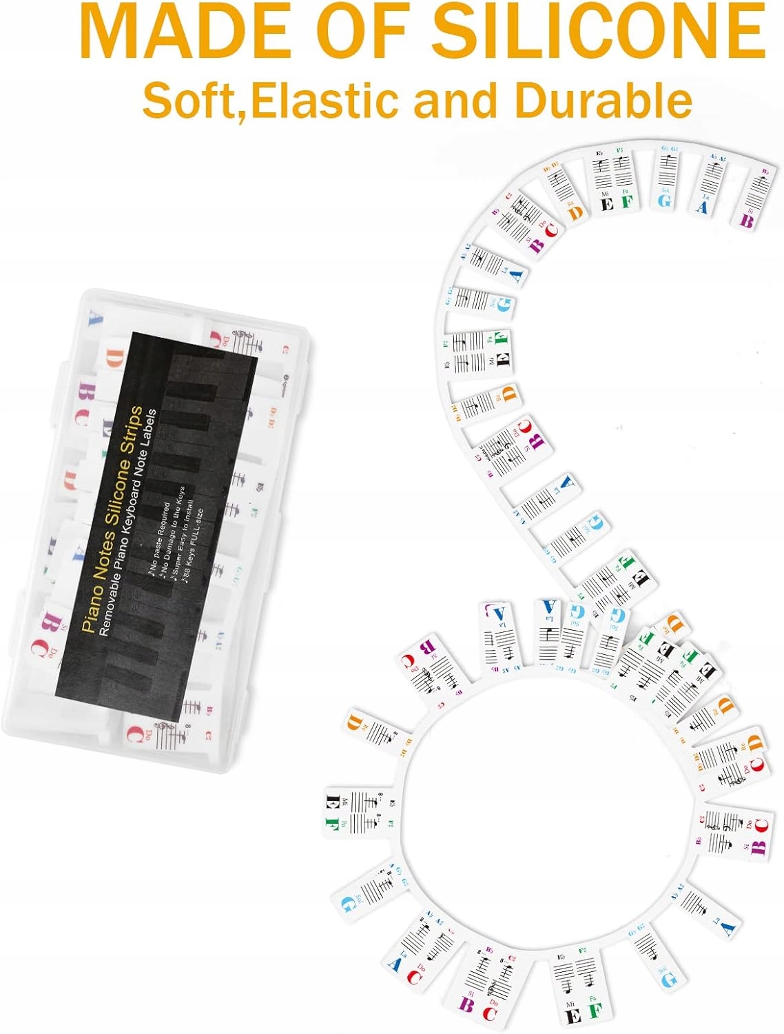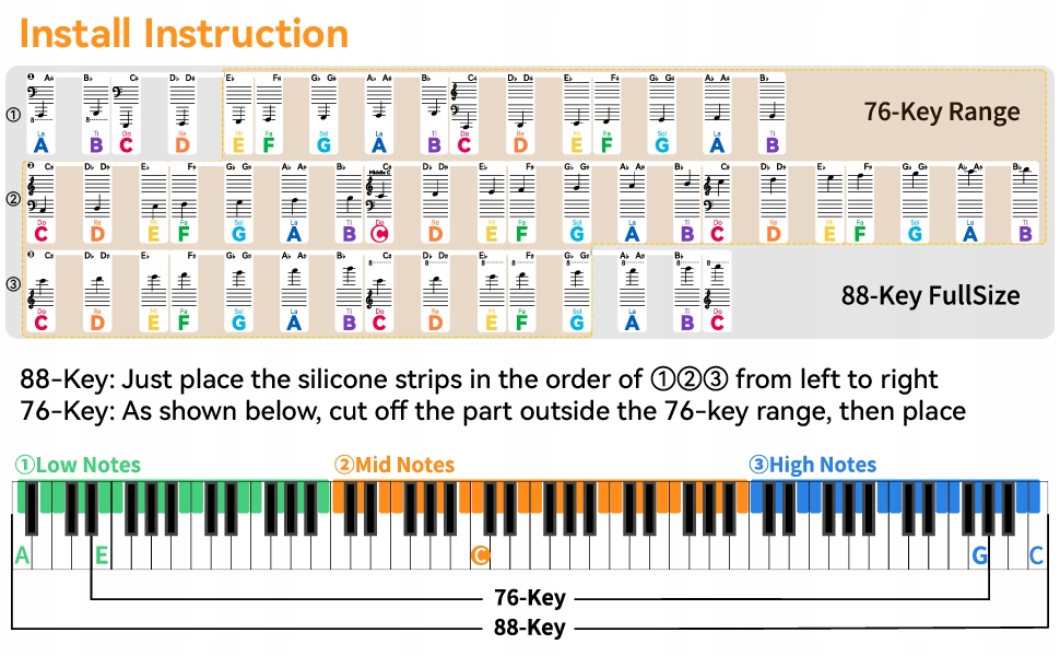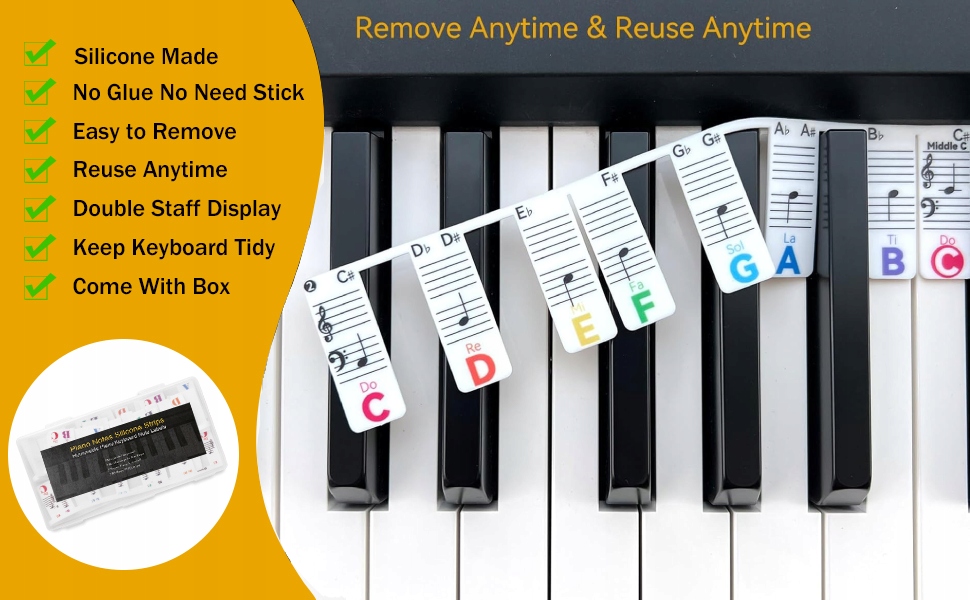 Эти музыкальные полосы сделаны из силикона, а музыкальные этикетки связаны друг с другом, устраняя необходимость приклеить их к клавишам один за другим, в отличие от традиционных наклеек на фортепиано. Установка проста. Кроме того, их можно легко удалить, не оставляя следы, сохраняя клавиатуру чистой и заказом.
