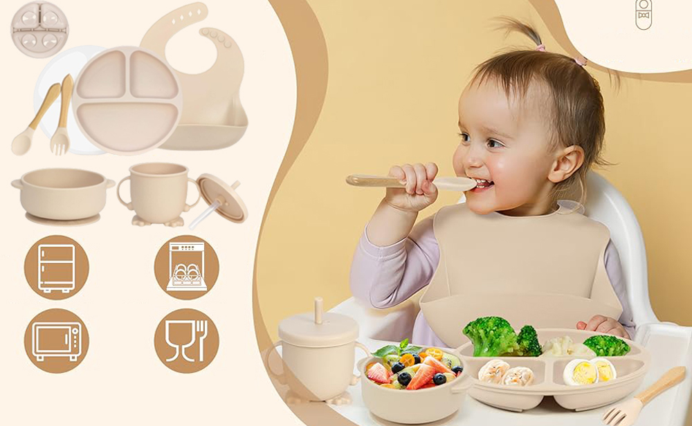 -этот набор продуктов с 7 частями для младенцев содержит все необходимое для легкого и беззастенчивого кормления. Он содержит силиконовую вилку, силиконовую ложку, силиконовую пластину для детей с крышкой, силиконовым салвизиком, силиконовой миской и силиконовой чашкой. Каждый элемент изготовлен из высококачественного, безопасного для пищевого силикона и не содержит BPA. падающий Он разделен на три секции, чтобы подавать разные блюда и оснащен крышкой для облегчения хранения приготовленной пищи для ребенка и хранения остатков.