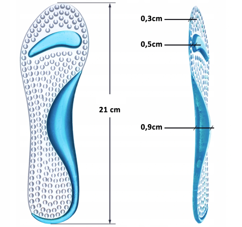 Активные женщины чувствуют усталость после целого дня на любимых высоких каблуках, которую можно значительно уменьшить, используя эти стельки. Четко очерченные синие места — это утолщения вставки, размещенной в ключевых местах. Они расположены там, где стопа испытывает наибольшую нагрузку. Подушка в передней части не дает ноге смещаться вперед. Вторая, более длинная подушка поддерживает свод стопы, предотвращая плоскостопие.