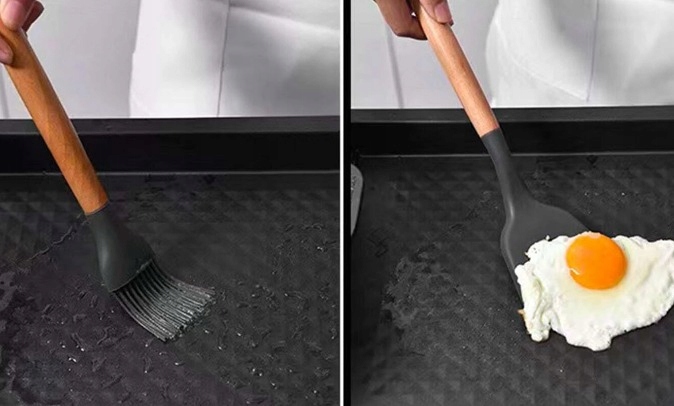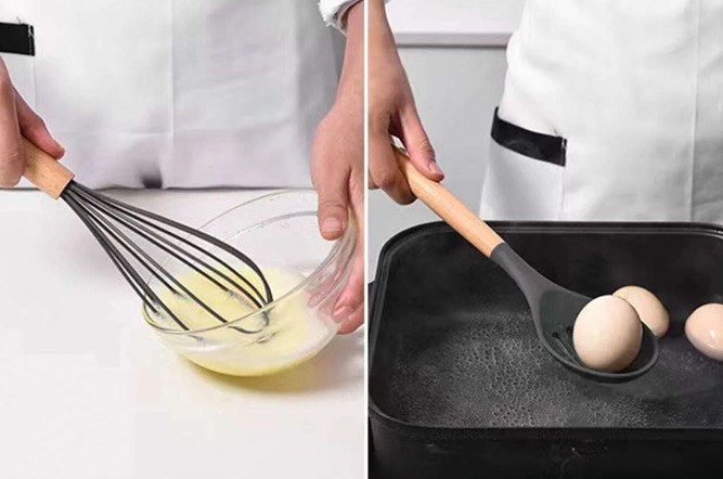 Силиконовые аксессуары изготовлены из высококачественного материала. Идеально хорошо подходит для тефлоновых сковородок или других деликатных поверхностей. У них удобная деревянная ручка, а благодаря ее легкости вам будет приятно использовать ее на кухне.