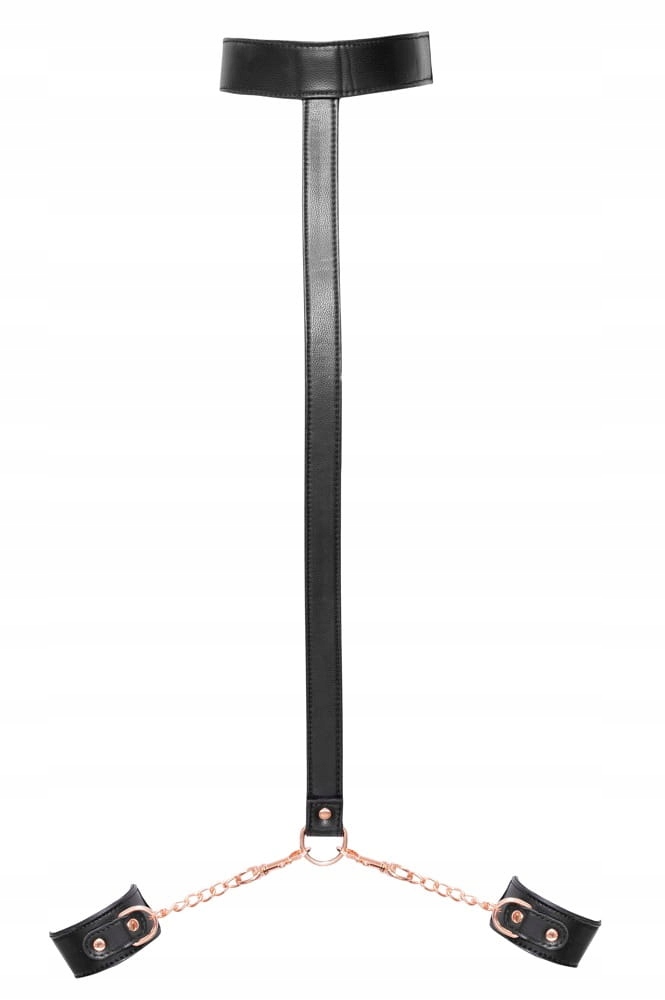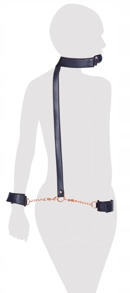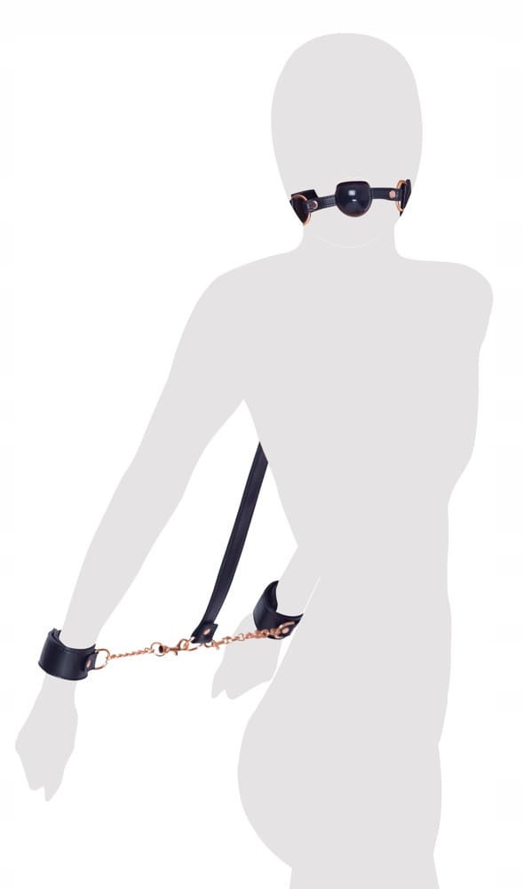 Силиконовый кляп-наручники от Bad Kitty в стильном кожаном стиле с металлическими деталями цвета розового золота.
