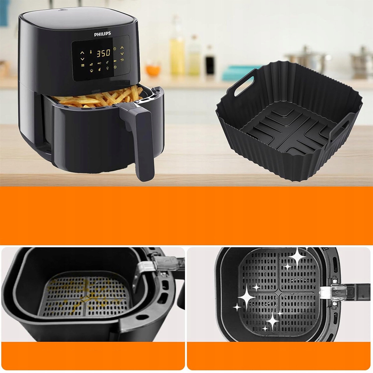 - 【Легко чистить】: две многоразовые силиконовые формы для фритюрницы позволяют легко содержать корзину в чистоте и упрощают очистку. Они также защищают антипригарное покрытие фритюрницы и продлевают срок ее службы.