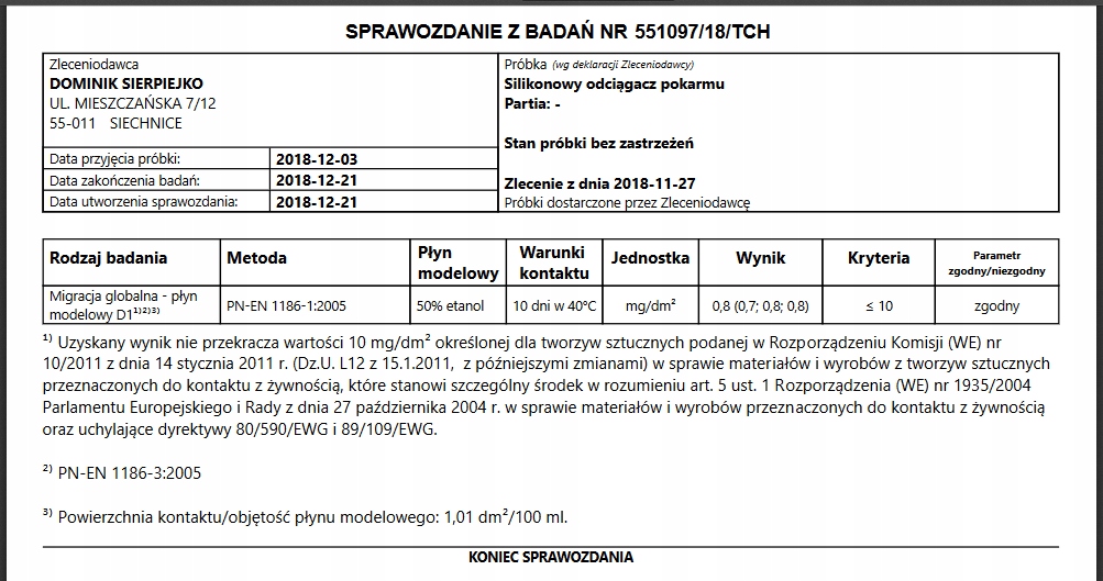 PN-EN 1186-1:2005 и PN-EN 1186-3:2005 для материалов и изделий, предназначенных для контакта с пищевыми продуктами – подтверждено лабораторными испытаниями, проведенными в Польше! В лаборатории проверили, не попали ли в хранившееся в бутылке молоко какие-либо вещества, содержащиеся в силиконе. Результат в 12,5 раз лучше стандартов ЕС.