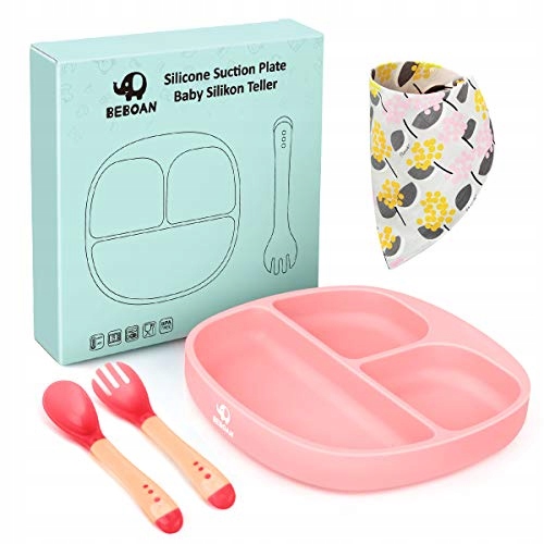 Детская тарелка BEBOAN, набор силиконовых тарелок на присосках для младенцев, малышей и детей, набор детского питания с присосками, ложкой + вилкой + нагрудником, портативная детская тарелка без BPA (сладкий розовый)