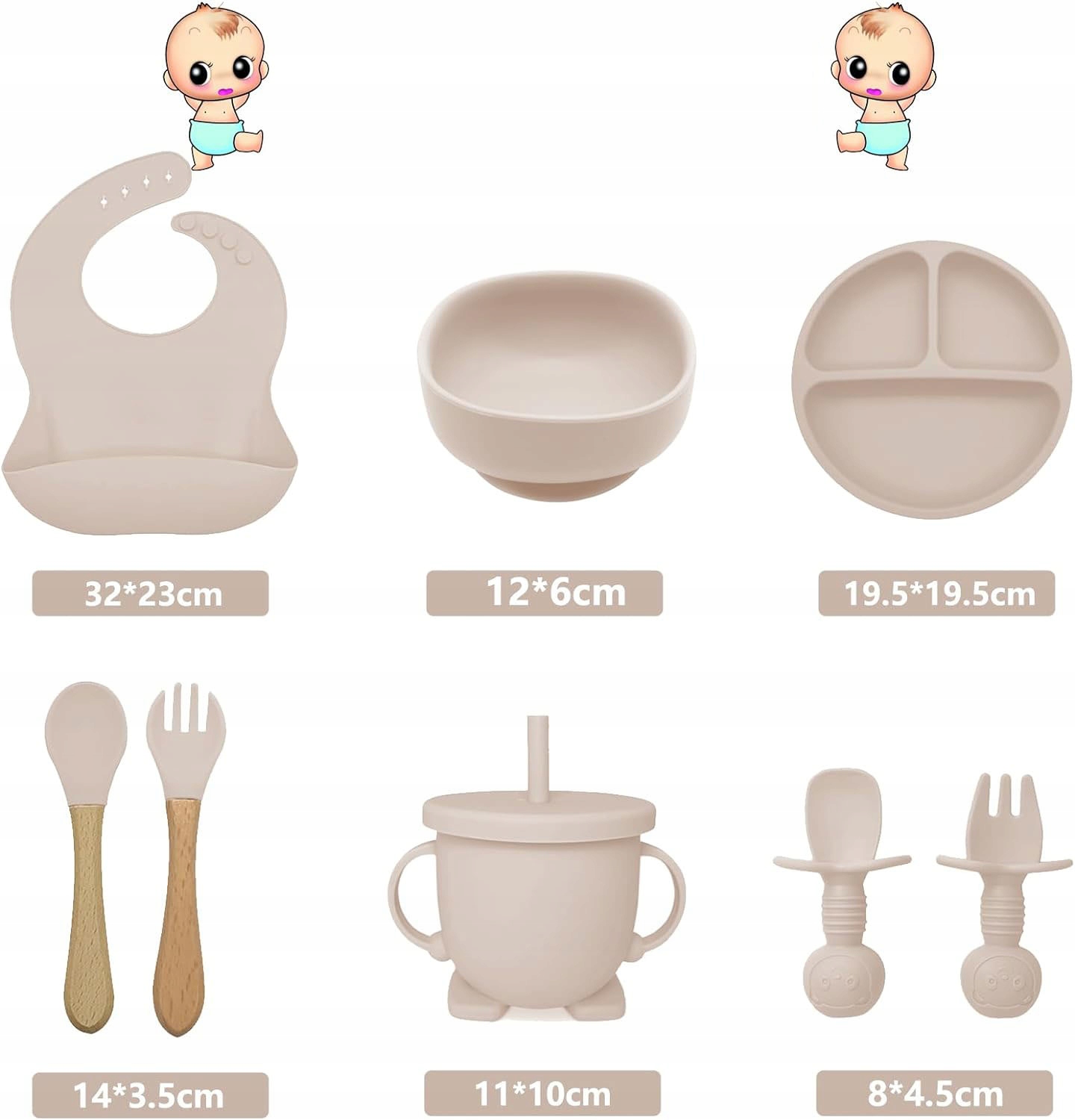 - В комплекте 2 силиконовые вилки, 2 силиконовые ложки, силиконовый нагрудник, силиконовая тарелка, силиконовая миска и силиконовая чашка для питья. Каждый элемент изготовлен из высококачественного пищевого силикона и не содержит BPA.