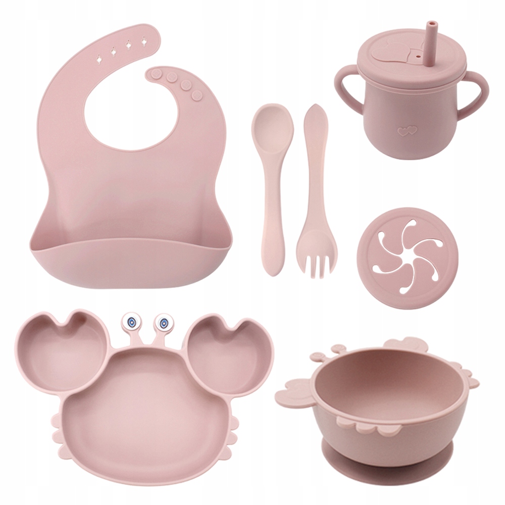 🦀В комплект входит одна вилка, ложка, нагрудник, тарелка, миска и чашка с двумя крышками. Каждый элемент изготовлен из высококачественного пищевого силикона и не содержит BPA.