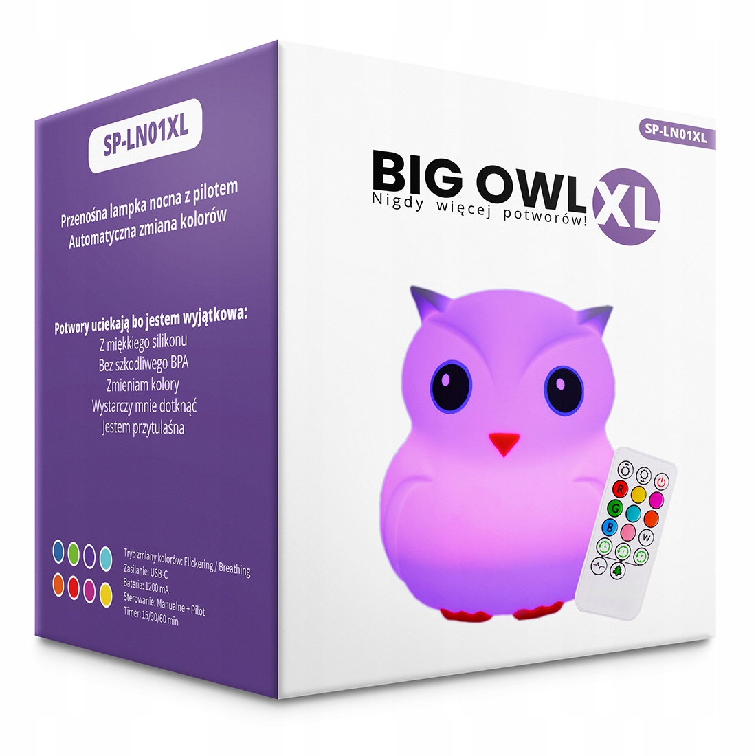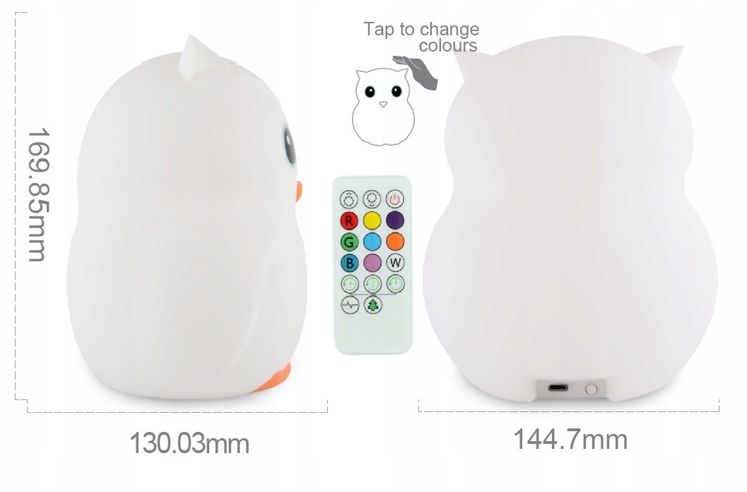 Вы можете легко зарядить Big Owl XL с помощью кабеля USB-C. b> Практичный пульт дистанционного управления позволяет точно выбрать тип активности лампы и цвет света из 9 цветов. В зависимости от ваших потребностей вы также можете регулировать яркость лампы. Полезная функция таймера позволит заранее спланировать время работы ночника на 15, 30 или 60 минут.