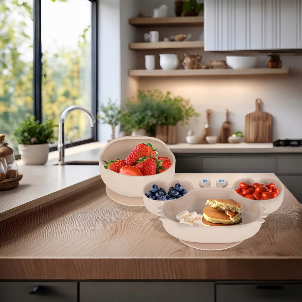 Миска и тарелка имеют присоску, которая не позволит малышу опрокинуть посуду – тарелки больше не будут падать во время еды.