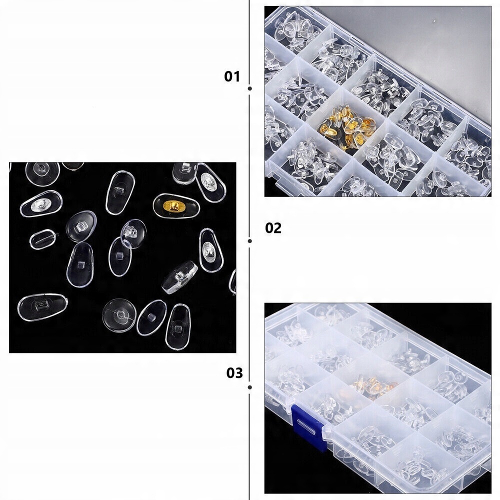 Представляем наш полный набор для ремонта очков, в который входят 15 различных моделей мягких силиконовых накладок для носа. Этот набор является идеальным решением для людей, носящих очки, которым необходимо заменить поврежденные или изношенные носовые упоры.