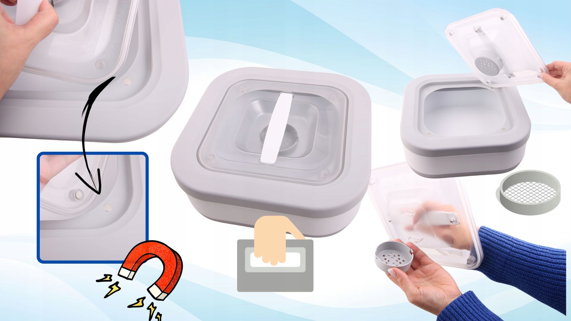 - ✔Удобная крышка – контейнер оснащен крышкой с сильными магнитами, что позволяет легко его транспортировать. перенеси его в любое место. Благодаря этому контейнер герметичен и содержимое не выливается.