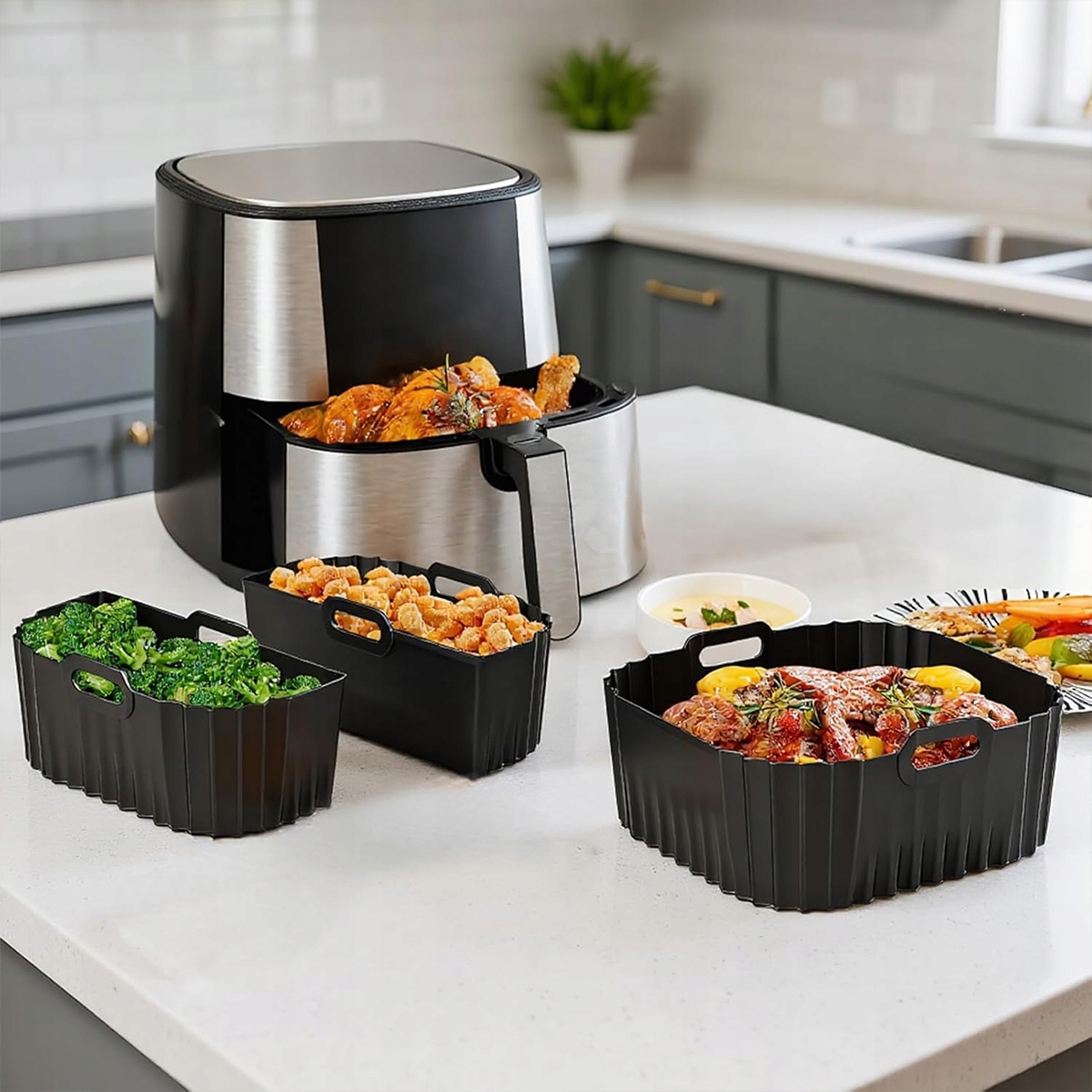 Аксессуары для аэрофритюрницы изготовлены из пищевого силикона, многоразовые, не содержат BPA, нетоксичны, устойчивы к разрыву и выдерживают температуру от -40°C до 230°C. Они подходят не только для аэрофритюрницы, но и для микроволновой печи, духовки, пароварки, холодильника и другой кухонной техники — охватывают весь процесс приготовления, готовки и хранения продуктов.