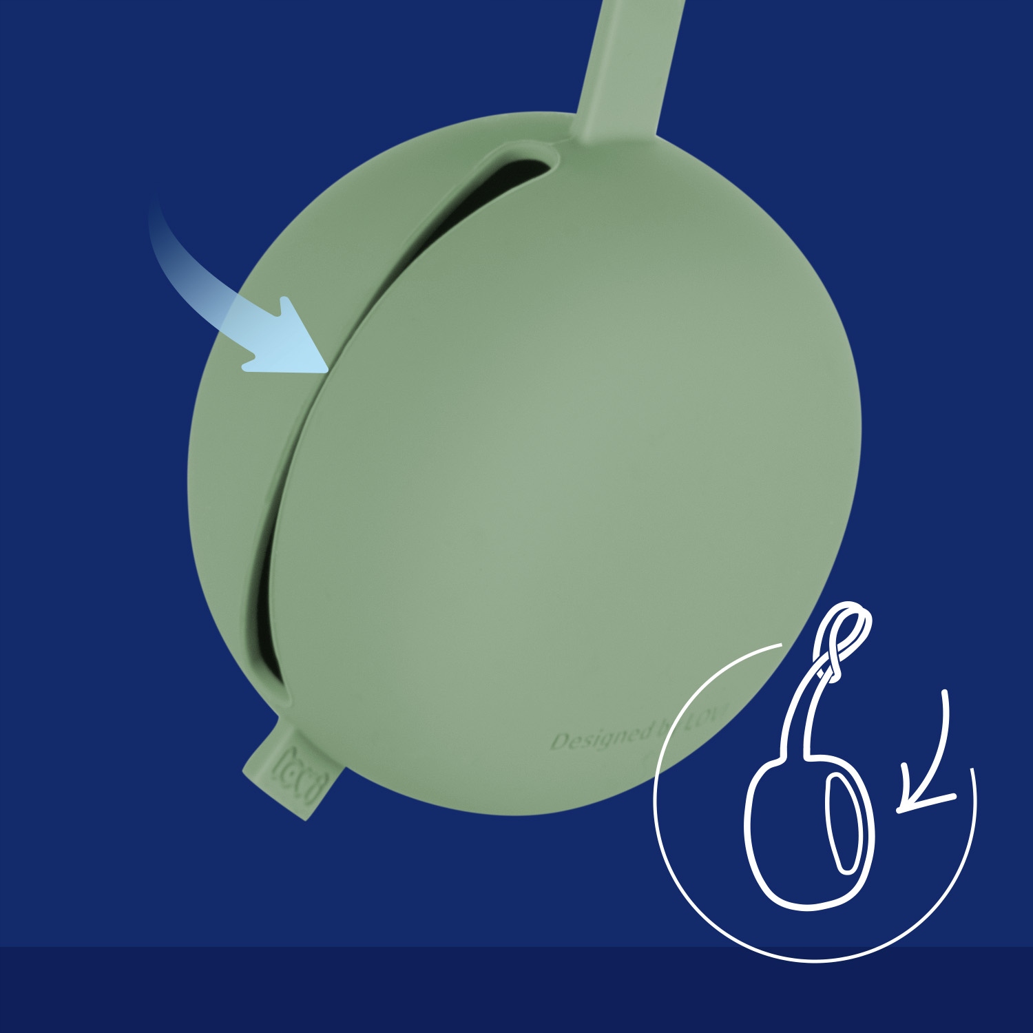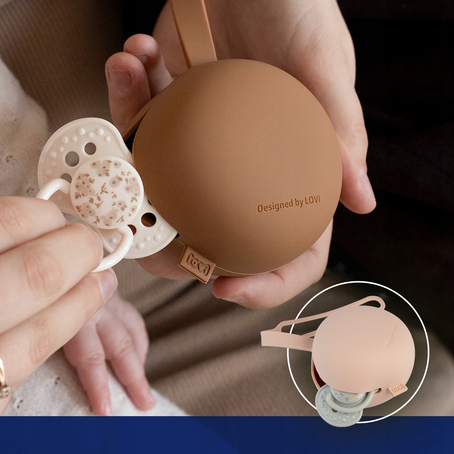 В футляр вмещается до двух сосок, включая запасную. Гибкая ручка легко прикрепляется к сумку или коляску, а специально разработанное отверстие сбоку позволяет вставлять и извлекать соску, не снимая чехол.