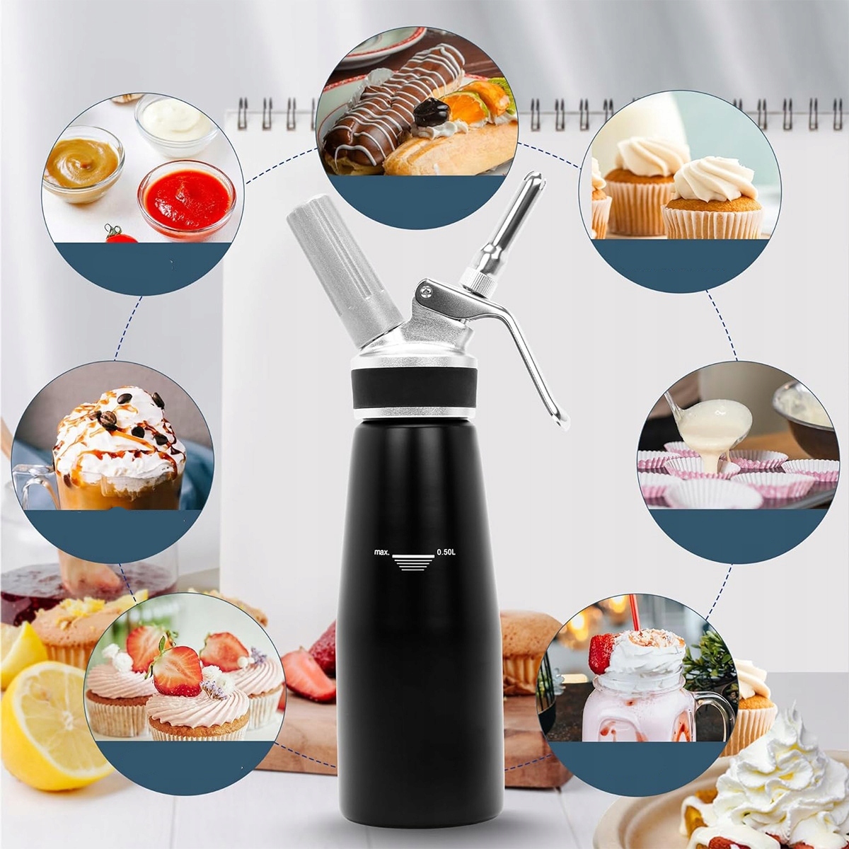 Необходимый для крема 500 мл, высококачественный алюминиевый кремовый сифон с 3 соплами из нержавеющей стали и держателем капсулы для сливок, эспумы, холодных и теплых соусов (черный) h1>