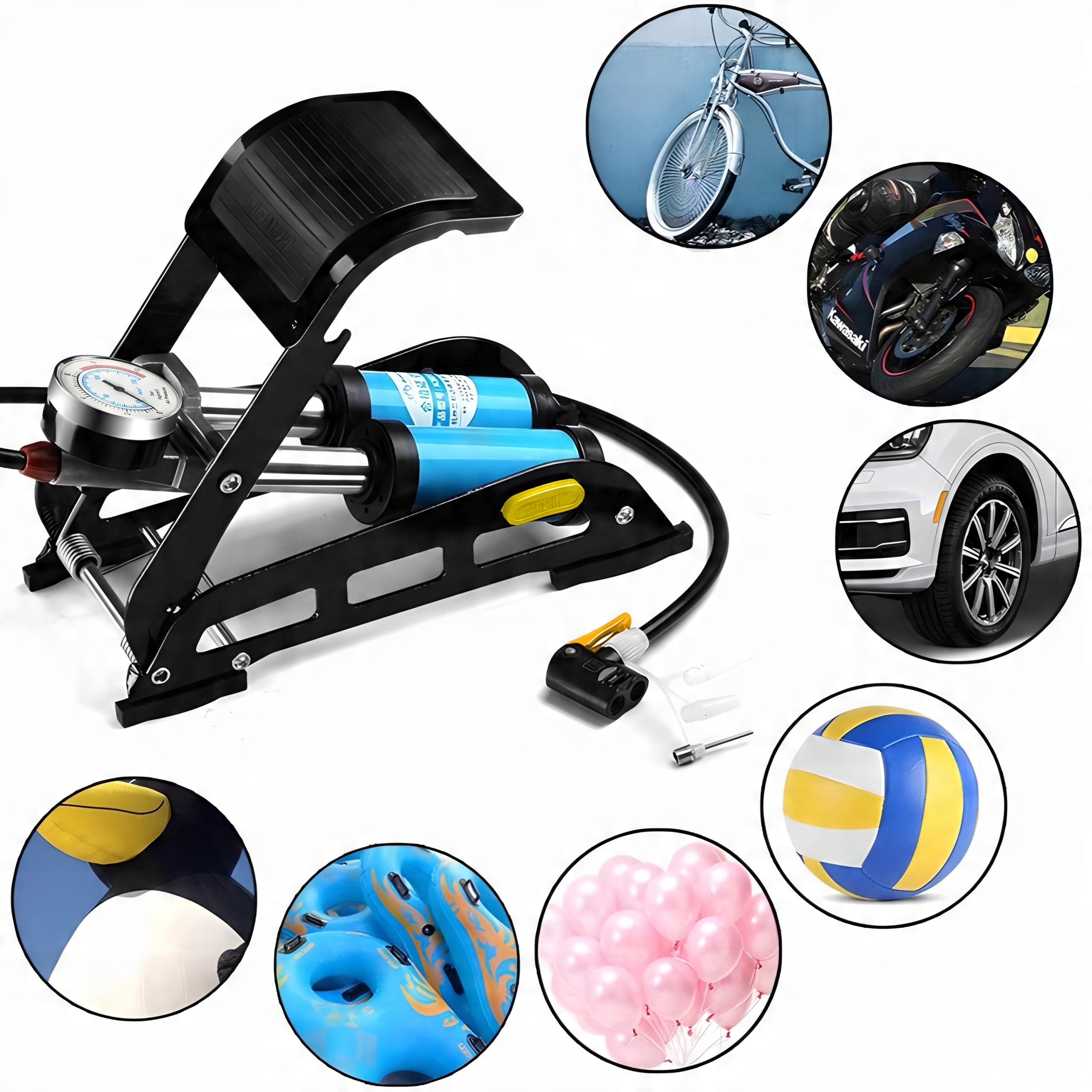 Универсальный автомобильный двухпоршневой насос — инструмент, улучшающий работу не только дома. Благодаря своей конструкции его также можно использовать в сфере услуг и для индивидуального обслуживания на дому. Эффективная двухпоршневая система обеспечивает гораздо более быстрое надувание. Насос идеально подходит для накачивания колес велосипедов и мотоциклов, мячей, матрасов и колес автомобилей. Имеет ножку с фиксатором и манометр до 10 бар.